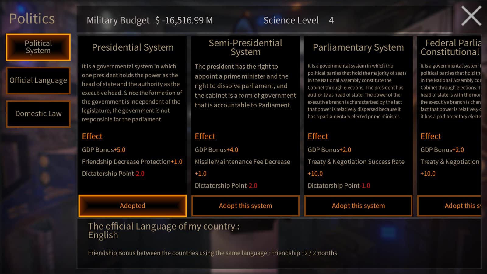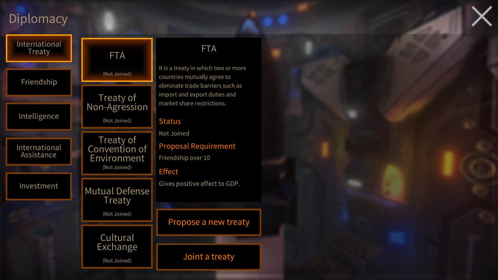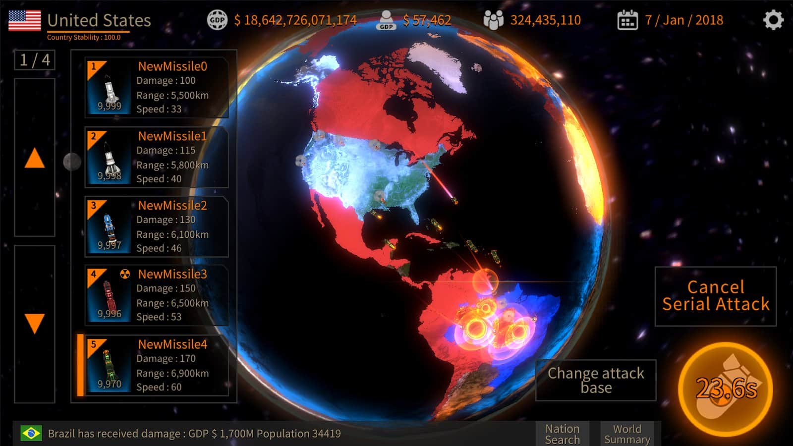 Missile Diplomacy - масштабная геополитическая стратегия в которой ваша основная задача вывести выбранную вами страну на лидирующие позиции на мировой арене, при этом всего доступно более 120 государств. В игре реализована интересный симбиоз, принятия масштабных и глобальных решений, при этом все основные решения предстоит принимать основываясь на ракетных технологий, при этом можно использовать как мирные элементы, так и военные вмешательства. Реалистичная модель и полная свобода действий позволят вам в полной мере реализовать все свои стратегические возможности.
