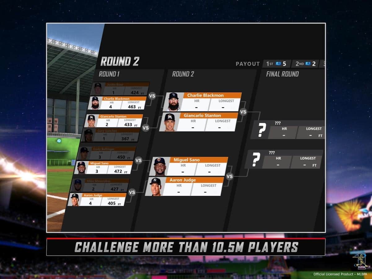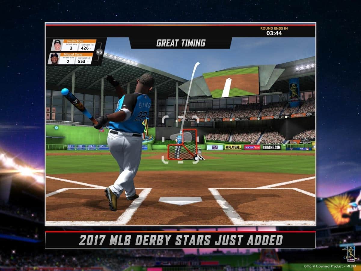 MLB.com Home Run Derby - реалистичный симулятор игры в бейсбол для андроид. Всем поклонникам и фанатам игры - обязательно стоит обзавестись таким приложением! У вас появится уникальная возможность сыграть за легендарных Хосе Батиста и Марка Трамбла. В игре есть возможность играть с друзьями и одиночный режим, в котором можно сделать карьеру и обзавестись парой-тройкой кубков! Немножко придется потренироваться с управлением, но это лишь дело привычки! Устраивайте чемпионаты и делитесь своими достижениями на Facebook.