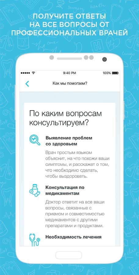 Mobile Doctor (Мобильный доктор) - приложение которое позволит вам без очередей и записей получить совет врачей, которые кстати работают в лучших клиниках Москвы. Программа позволит общаться как в текстовых чатах, так и по средствам видео, так же вы сможете прикрепить фото или результаты анализов. Время ожидания, по словам разработчиков, не более 3-х минут, а получение консультации в любое время, все что вам понадобиться это смартфон. Крайне полезной функцией в приложении является возможность создания личного кабинета. Присутствуют на сайте и врачи-педиатры, которые терпеливо будут общаться с взволнованными мамочками.