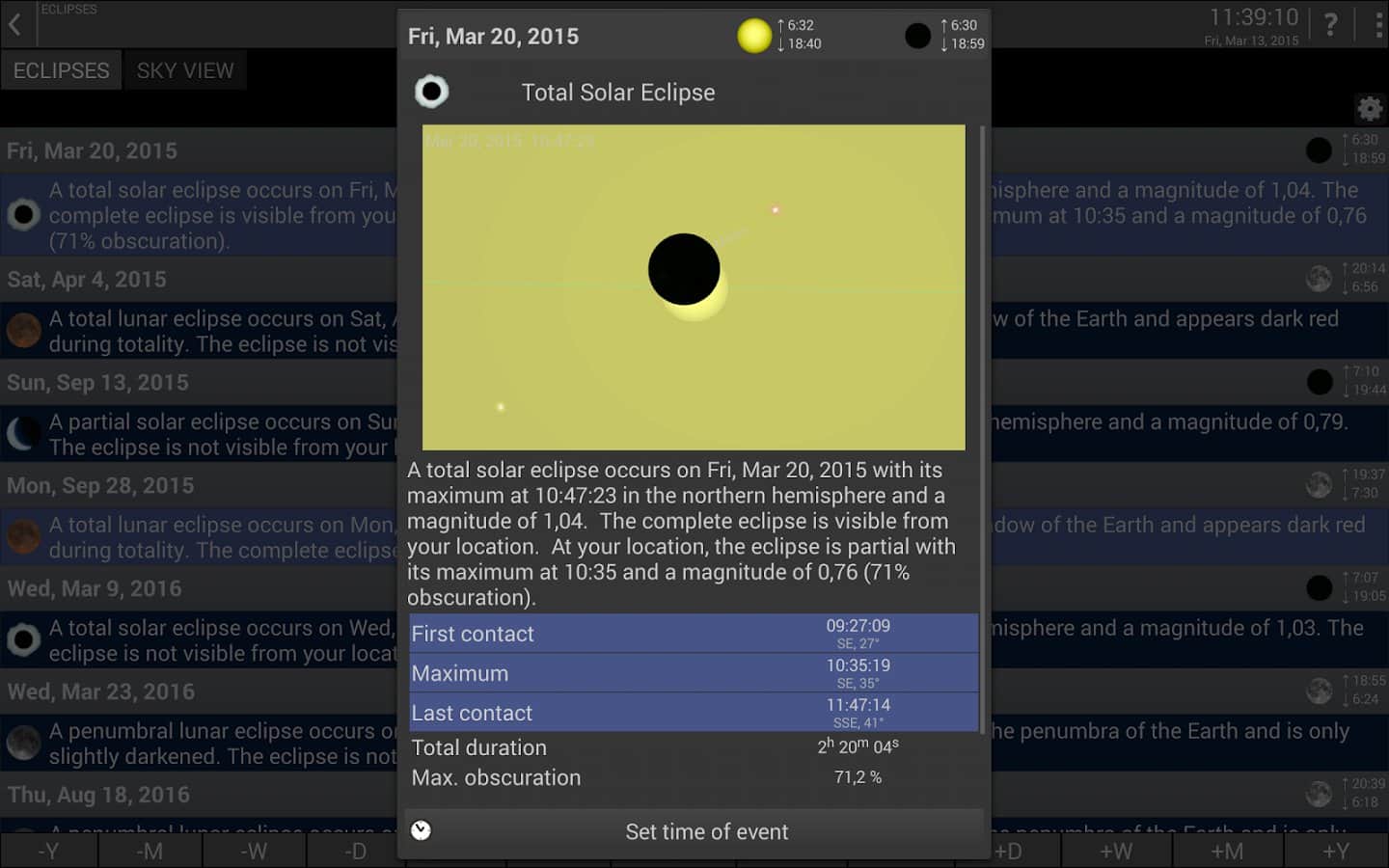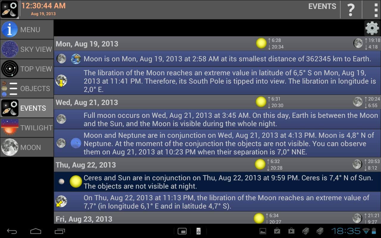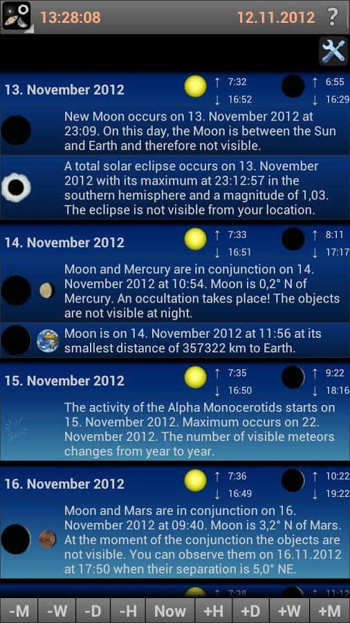- Календарь показывает подробные описания небесных явлений до следующих 31 дней