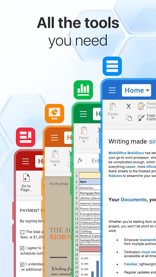 Работайте где угодно: создавайте, редактируйте и защищайте документы Word, таблицы Excel, презентации PowerPoint и PDF. Полная совместимость с Microsoft Office, Google Docs, OpenOffice и 100+ форматами. Конвертируйте в PDF одним кликом, заполняйте формы, digitally подписывайте — всё с продвинутой защитой. Интегрируйтесь с Google Drive, OneDrive, Dropbox или получите 5 ГБ на MobiDrive бесплатно. Форматируйте с pintar, отслеживайте изменения, применяйте формулы — без компромиссов! Без рекламы в Premium (используйте на 2 устройствах + ПК).