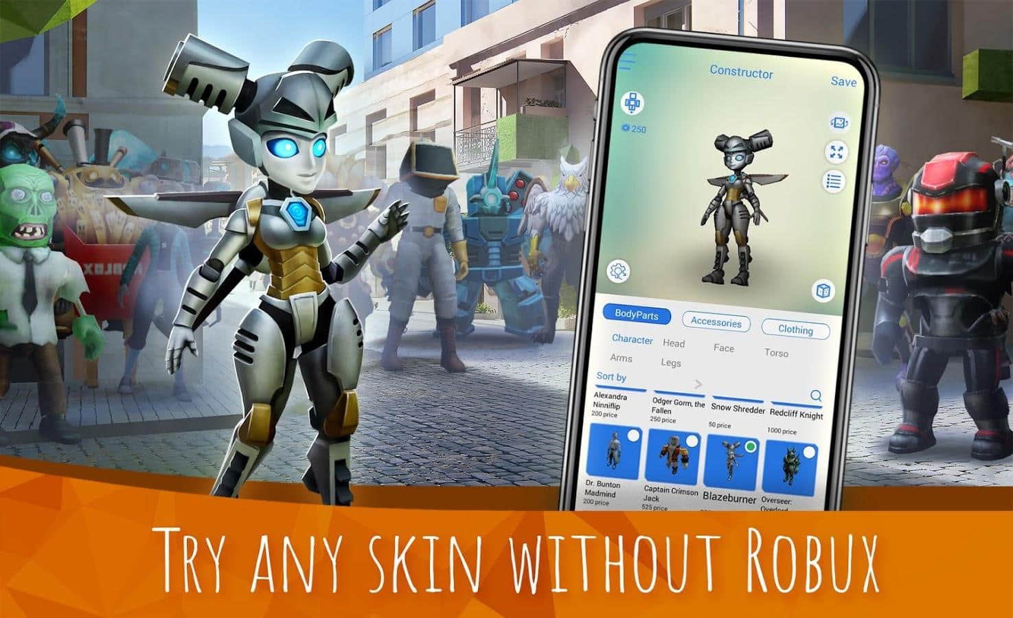 Не имеете возможности купить скины в игре Roblox, но очень хочется быть стильным и красивым? Опробуйте приложение MOD-MASTER for Roblox, где есть множество простых функций. Разные части образа (тело, лицо, одежда, аксессуары), готовые костюмы на любые события, кнопка случайной генерации, страница с сохранениями, создание скинов вручную, просмотр популярных карт, приобретение платных вещей абсолютно бесплатно и многое другое. Проявите фантазию, чувство вкуса и наслаждайтесь новыми внешними видами.