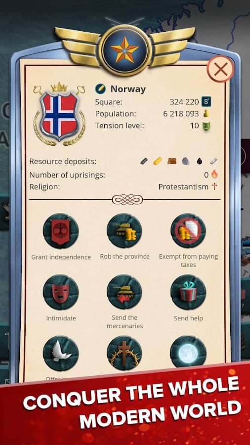 Modern Age – President Simulator – классическая геополитическая, экономическая и военная стратегия на андроид. В этой игре вы будете выступать в роли президента современного государства и стараться улучшить его за время своего правления. Готовы ли вы стать президентом России или Америки, а также других стран. Выбирайте себе государство из предложенных в игре и управляйте им расширяя свою территорию и осваивая новые технологии. Станьте мудрым и успешным правителем ведь ваше государство нуждается в таком президенте. Управляйте министрами и принимайте законы, а также занимайтесь торговлей с другими государствами.