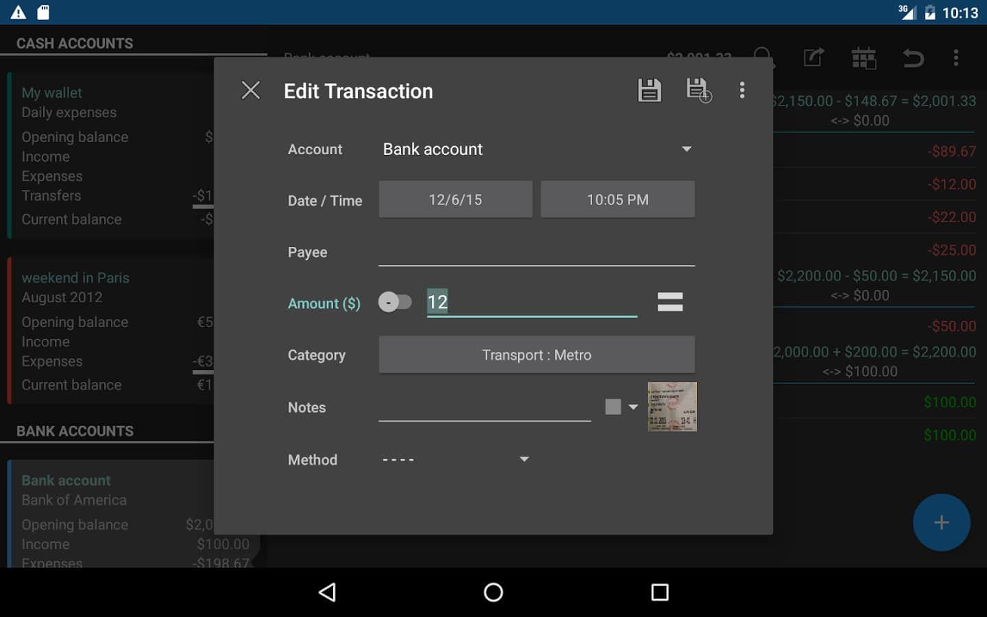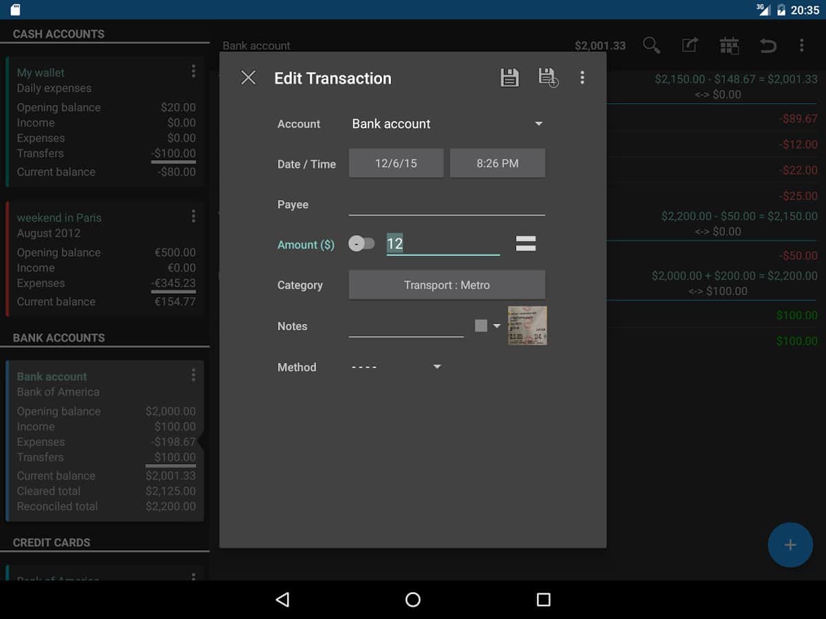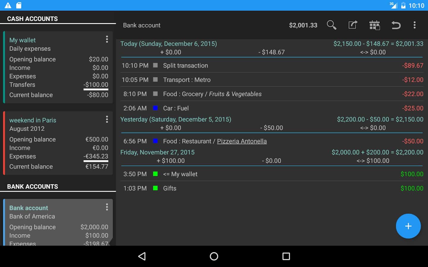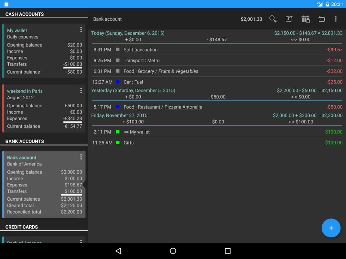 - Экспорт в CSV (MS Excel) и QIF, можно автоматически делиться (по электронной почте, FTP, Dropbox,...)