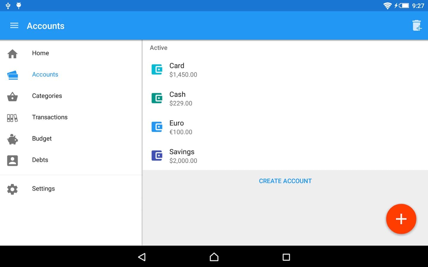 Создание счетов в разных валютах и разных типов (Наличные, Накопление, Банковский счёт, Банковская карта)