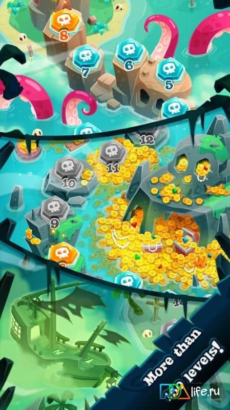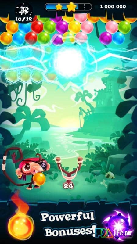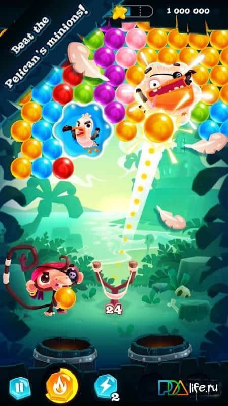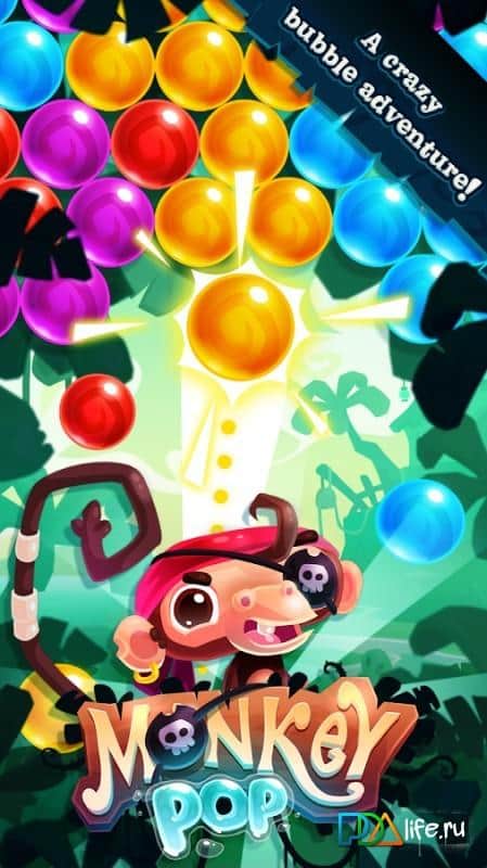 Monkey Pop - Bubble game - Вы великая мартышка пират, и к тому же весьма бесстрашны, именно по этой причине вы отправились спасать бедных рыбок из ловушки, в которую они угодили. Вам предстоит уничтожать шарики одинакового цвета, что бы разбить пузырьки, и пройти уровень. Делать это вы будете с помощью обыкновенной рогатки, однако если вдруг станет сложно, то на помощь придет один из супер приемов, которые сходу способны перевернуть ход игры.