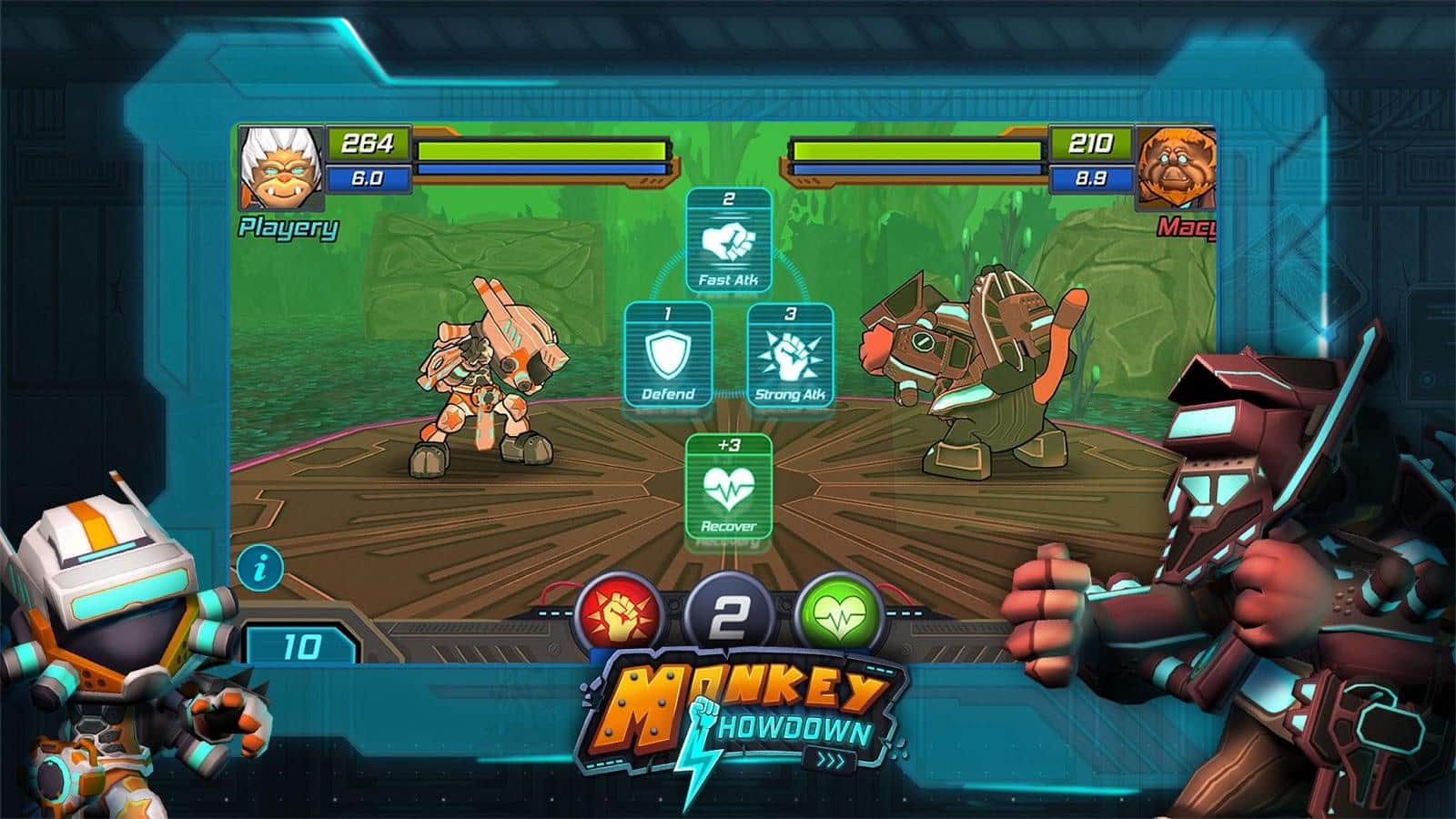 Monkey Showdown – пошаговый файтинг на андроид, где вы будете управлять обезьянами-воинами. Выбирайте себе героя из многочисленных представленных в игре персонажей и начинайте бой. Прокачайте своего героя, примерив на него различные улучшения и защиты. Выходите на ринг и участвуйте в непредсказуемых битвах с сильными соперниками. За бой вы сможете применять три вида действий такие как: атака, защита и восстановление здоровья. Применяйте их в различной последовательности и разрабатывайте свою тактику ведения боя, от которой будет зависеть исход битвы. После победы игрок вправе забрать у проигравшего все улучшения и бустеры, которые небыли защищены. Прокачивайте своего персонажа и сражайтесь с многочисленными игроками на арене.