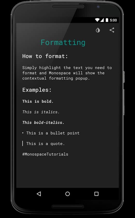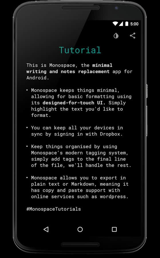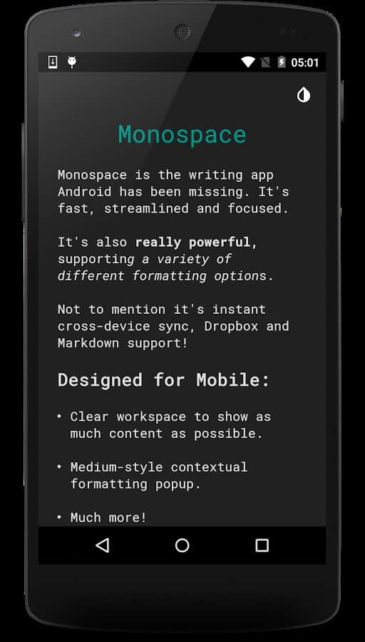 Писать заметки, или даже короткие зарисовки на смартфоне или планшете легко и приятно, но иногда сопутствующие приложения настолько перегружены дополнительными элементами, что работатьс ними становится сложно. Monospace Writer редактор другого типа: здесь нет ничего лишнего, только самое основное.