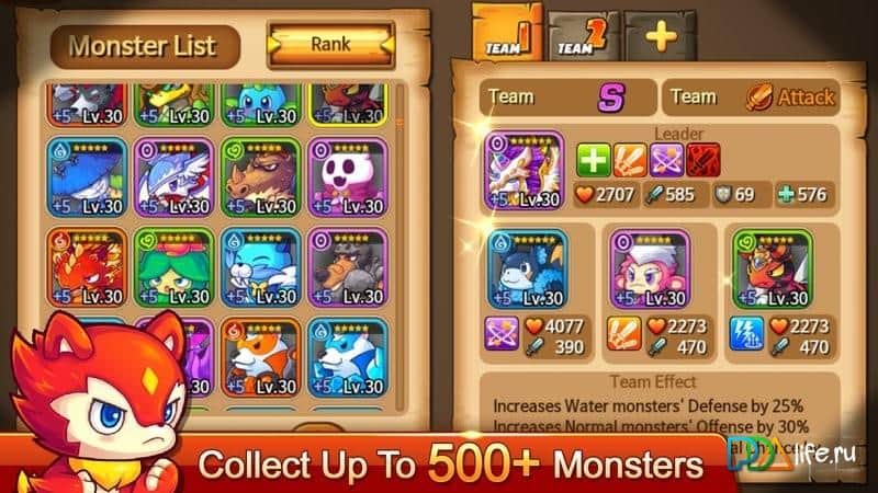 Monster Squad - Отправляйтесь в захватывающее приключение с отрядом монстров, сражаясь с различными врагами по пути. Найдите и откройте новых мощных монстров и путешествуйте с ними на различных и таинственных островах. Во время ваших поездок накопите более 500 монстров, ведь они имеют различные атрибуты: огонь, вода и земля. Развивайте своих монстров, чтобы разблокировать новых и более сильных. Эта великолепная ролевая игра не оставит вас равнодушными.