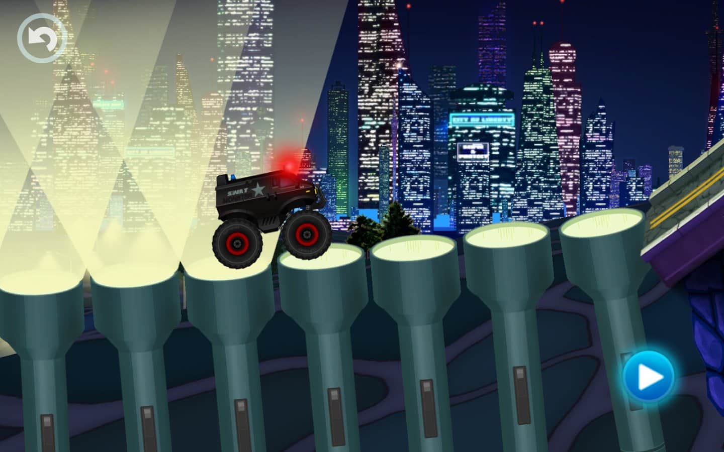 Monster Truck Police Racing – возьмите под свой контроль огромный полицейский грузовик-монстр и преследуйте преступника, гоняя по улицам городов. Жмите на педаль газа и разгоняйте свой грузовик до предельной скорости, чтобы преодолеть все препятствия и преграды, вставшие у вас на пути. Станьте лучшим гонщиком в этой игре и принесите мир и спокойствие на улицы города. Проходите все опасные миссии и пролетайте над горящими кольцами, преодолевайте преграды, взмывайте вверх с трамплинов и катайтесь внутри колец состоящих из машин. Открывайте для себя новые трассы, которые порадуют вас своим разнообразием. В игре представлено 20 грузовиков-монстров, 12 захватывающих уровня и отличные спецэффекты.