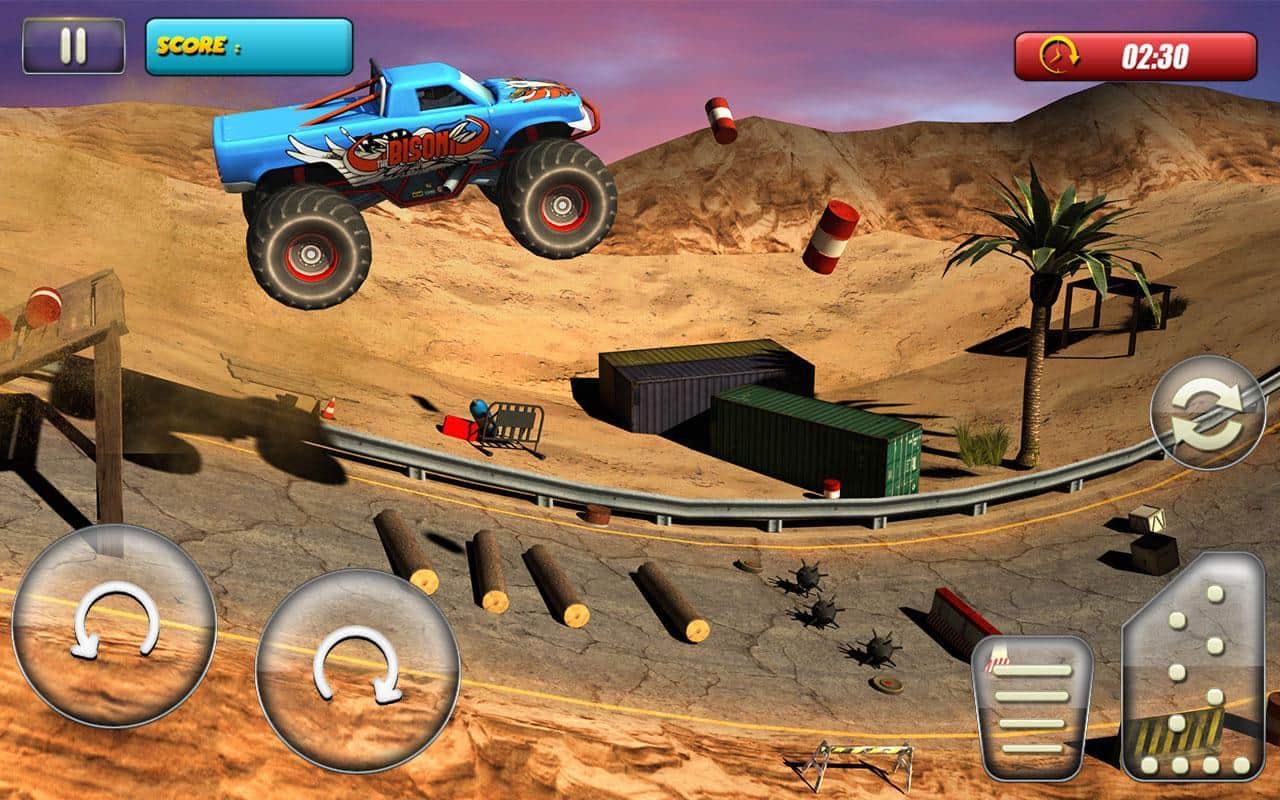 Monster Truck Rider 3D – гонки по опасным трассам на грузовиках-монстрах с отличной физикой. В этой игре на андроид вы возьмете под свой контроль огромный грузовик и проведете его по многочисленным трассам игры, обходя все препятствия и преграды на пути. Приготовьтесь к экстремальной езде, управляя грузовиков. Давите на педаль газа до упора и разгоняйте свой грузовик, до предельной скорости выполняя головокружительные трюки и прыжки с трамплинов. Проезжайте по крутым склонам и холмам, а также объезжайте завалы и преграды. Постарайтесь не перевернуть свой грузовик иначе игра для вас закончиться, и придется проходить все уровни заново. Проходите многочисленные миссии игры и открывайте для себя новые грузовики и машины.