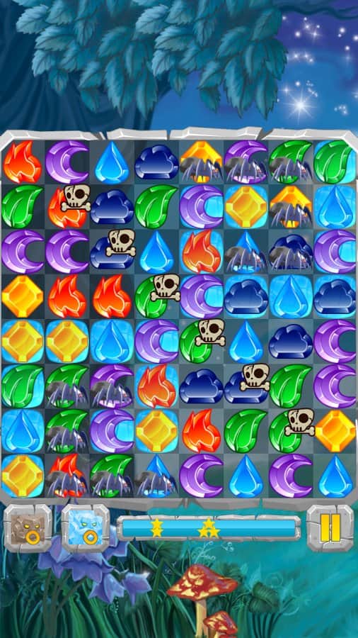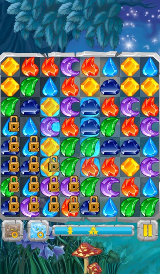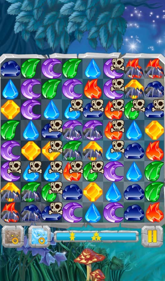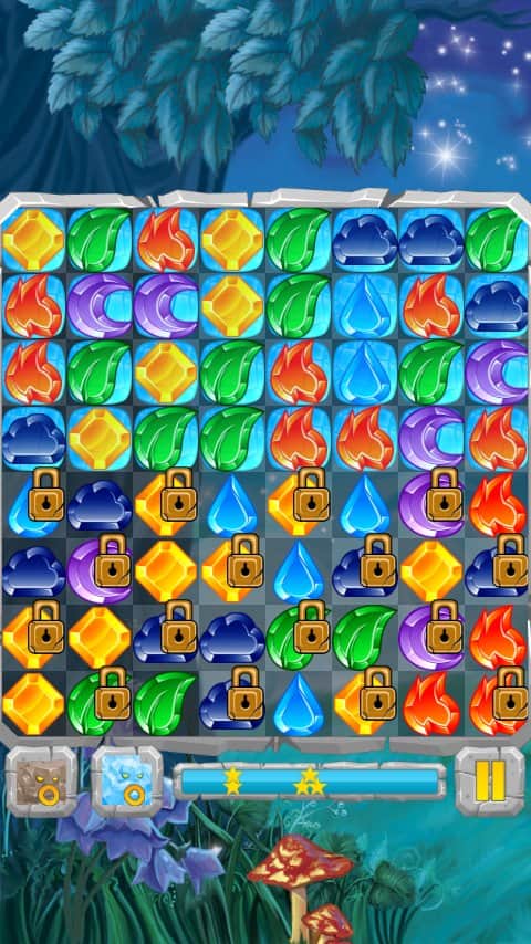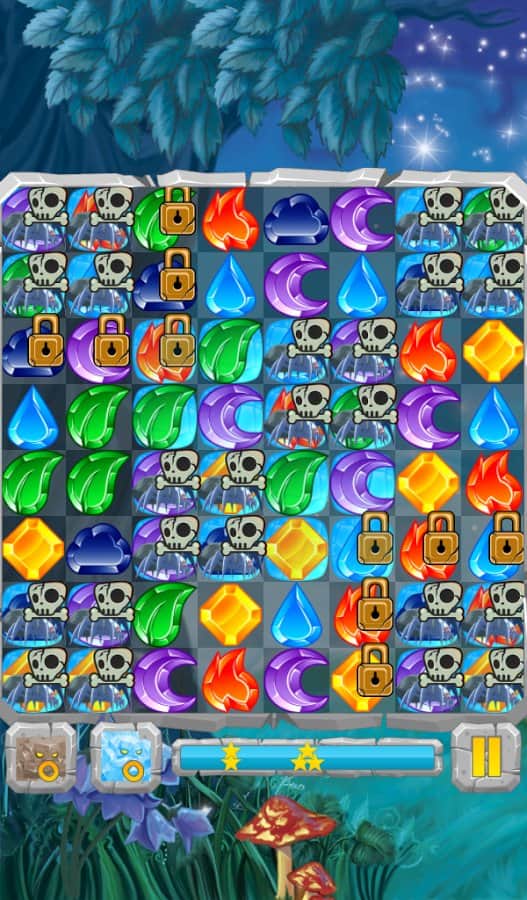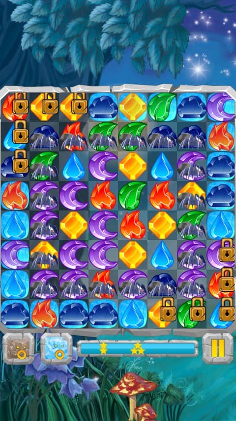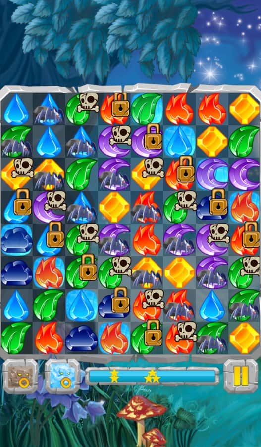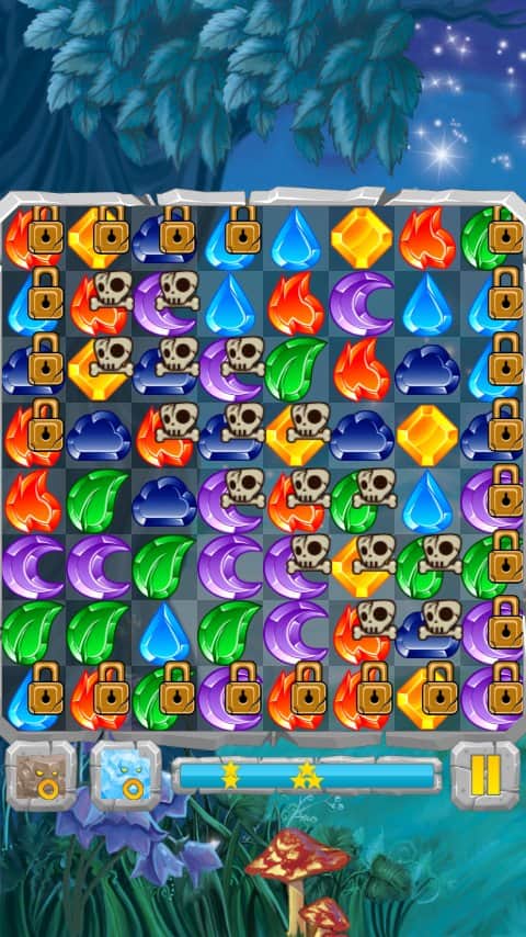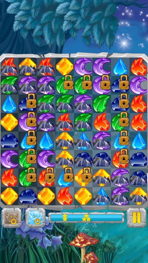 Лунные Камни / Moon Jewels - Это игра «3 в ряд», в которой множество различных уровней от самого простого до самого сложного. Выстраивайте камни три или более в ряд и столбцы, разблокируя замороженные ячейки, разрушайте ячейки с костями и замками, уничтожайте пауков. Собирай те камни стихий и активизируйте их. Для того, чтобы создать стихийный камень, выстроите 4 или более камней. Камни с костями можно разрушить только магией, а камни с замками только выстроив 3 камня в ряд.