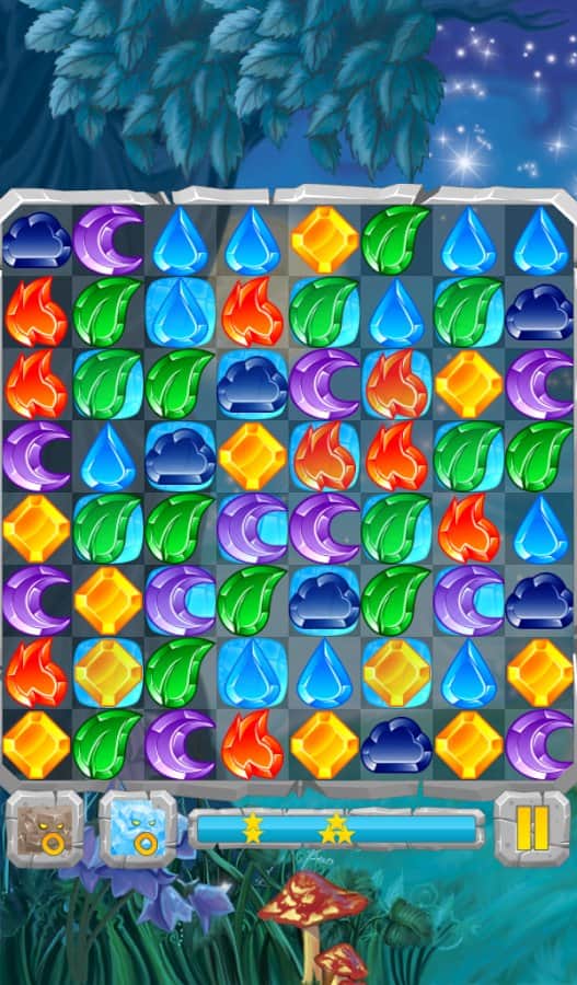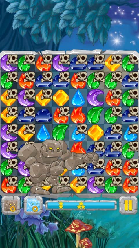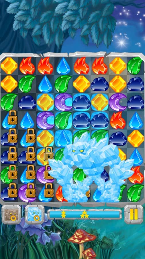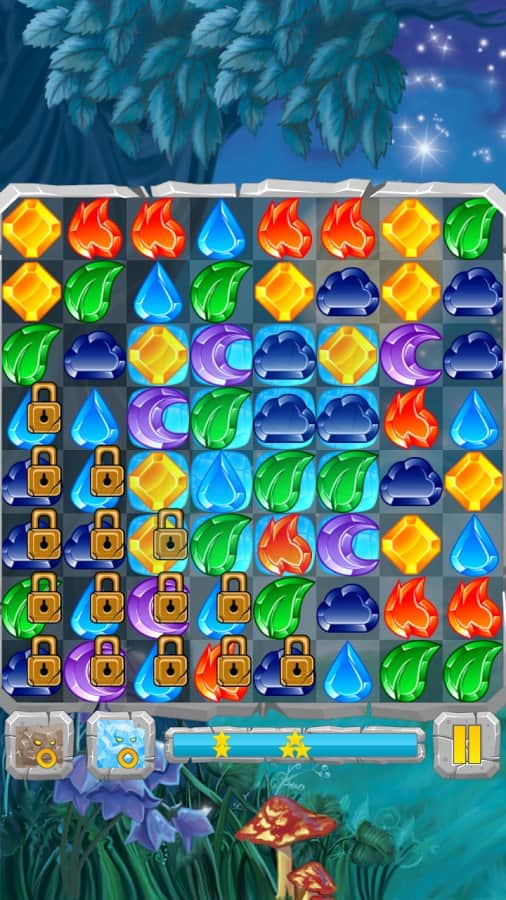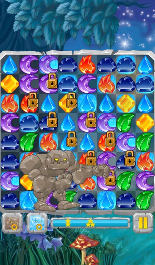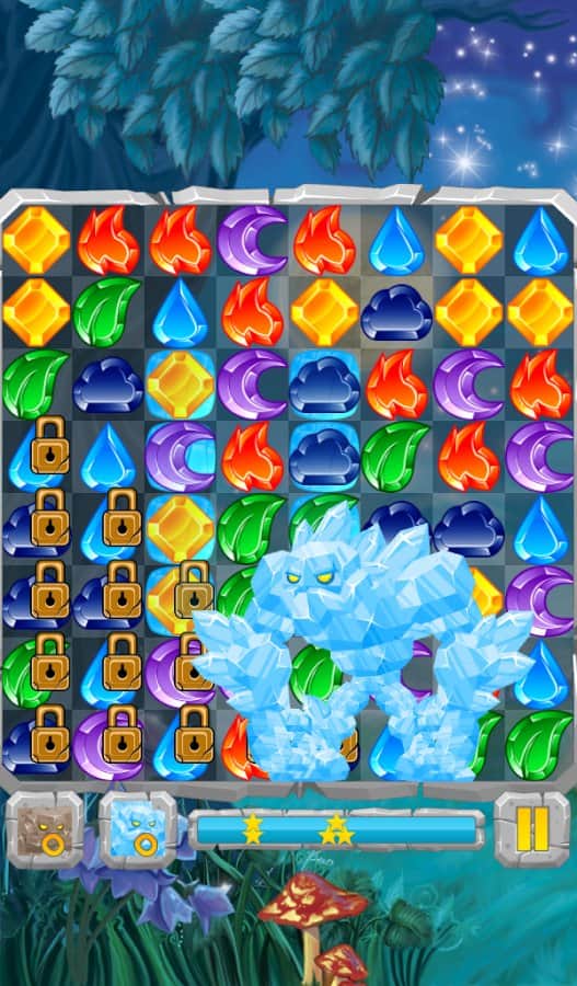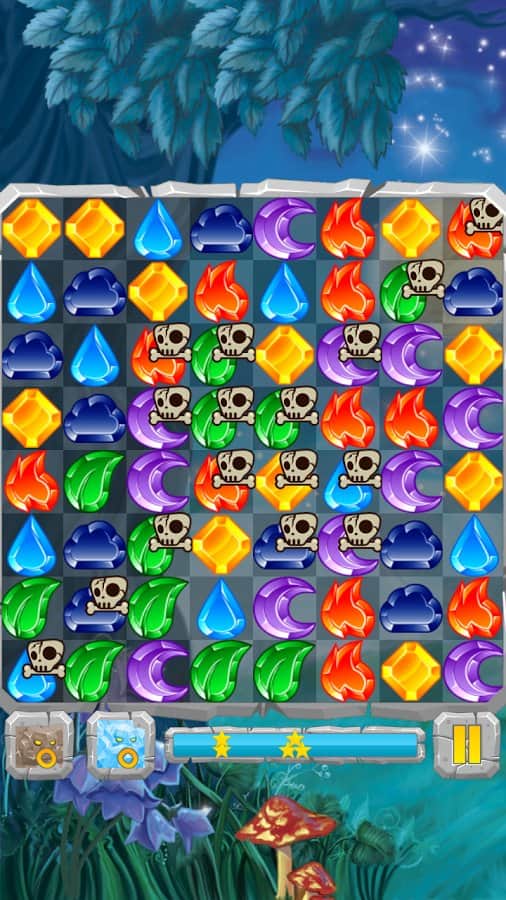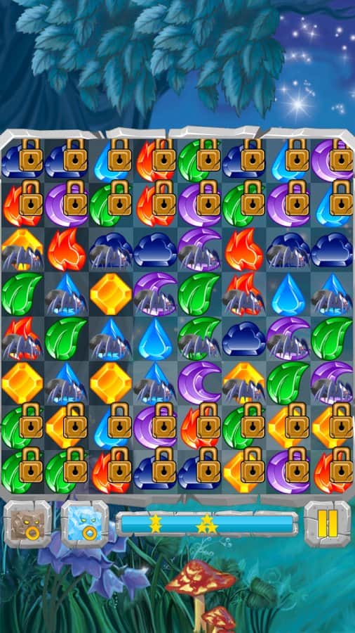 Лунные Камни / Moon Jewels - Это игра «3 в ряд», в которой множество различных уровней от самого простого до самого сложного. Выстраивайте камни три или более в ряд и столбцы, разблокируя замороженные ячейки, разрушайте ячейки с костями и замками, уничтожайте пауков. Собирай те камни стихий и активизируйте их. Для того, чтобы создать стихийный камень, выстроите 4 или более камней. Камни с костями можно разрушить только магией, а камни с замками только выстроив 3 камня в ряд.
