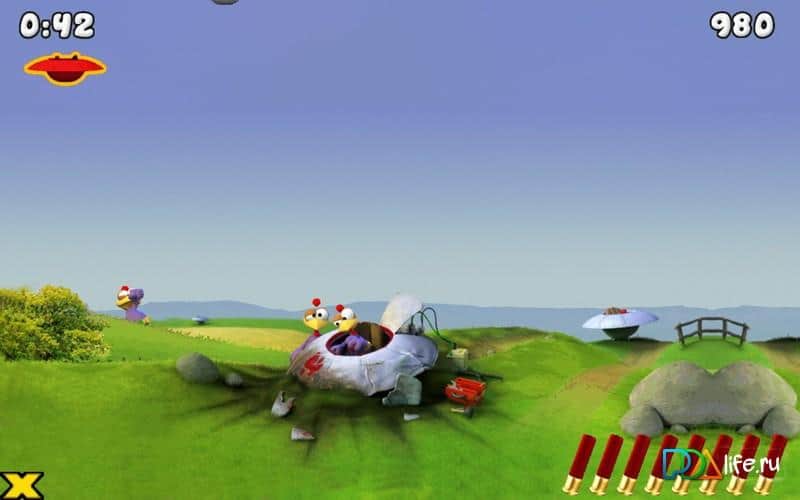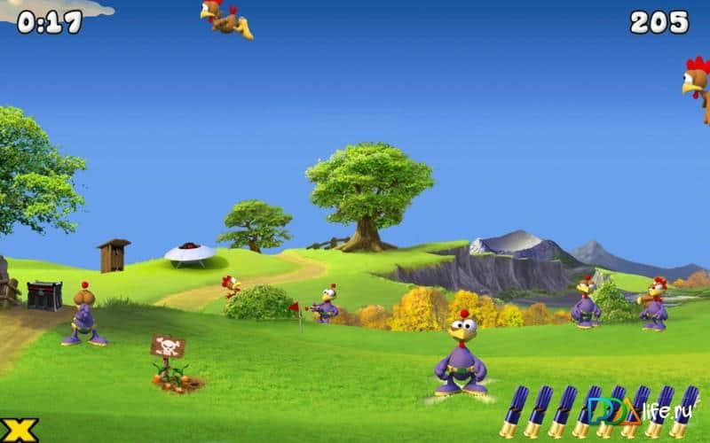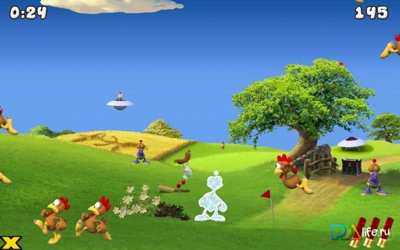 Moorhuhn Invasion - веселый тир, в котором вам с помощью ружья предстоит отстреливать наглых кур. Ваша задача состоит в том, чтобы отстреливать летающих, прыгающих, бегающих и появляющихся в неожиданных местах кур. Так же на вашем экране будут появляться куры, летающие на тарелках НЛО и прилетевшие с других планет захватчики, их не так легко будет убить и у вас это не получится с первого раза. Отстреливайте кур, и не тратьте патроны в пустую, количество которых ограниченно. Игра порадует вас качественной графикой и сложными загадками, которые предстоит решать.