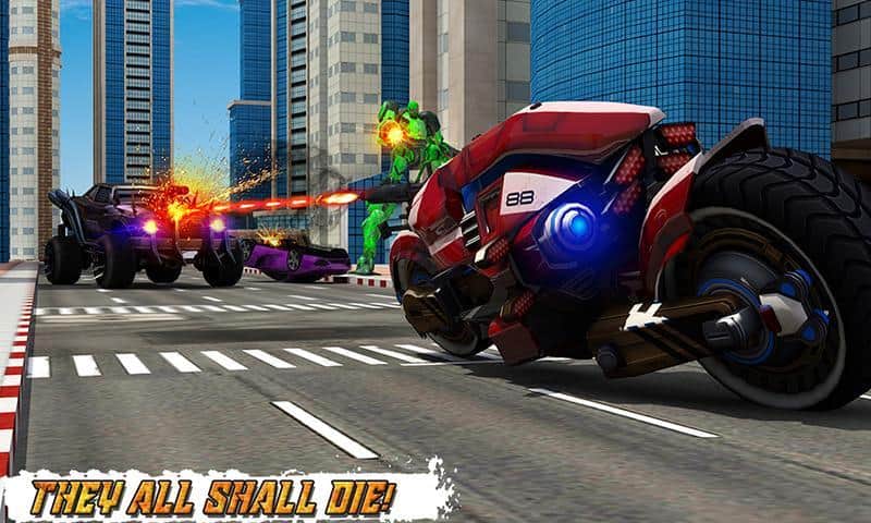 Moto Robot Transformation – экшен на андроид, где вы возьмете под свой контроль роботизированный мотоцикл, который должен охранять улицы от врагов. Выедите свой мотоцикл по оживленным улицам города и выполняйте поставленные миссии по уничтожению врагов виде гигантских роботов. Прокладывайте себе нужный для вас маршрут и ищите нарушителей порядка. Лавируйте в потоке бесконечного трафика на оживленных улицах города и ведите непрерывный огонь по врагам. На огромной скорости тараньте машины преступников и сбрасывайте их с трассы. Превращайтесь в робота и атакуйте противников. Постоянно следите за картой и ориентируйтесь на местности.