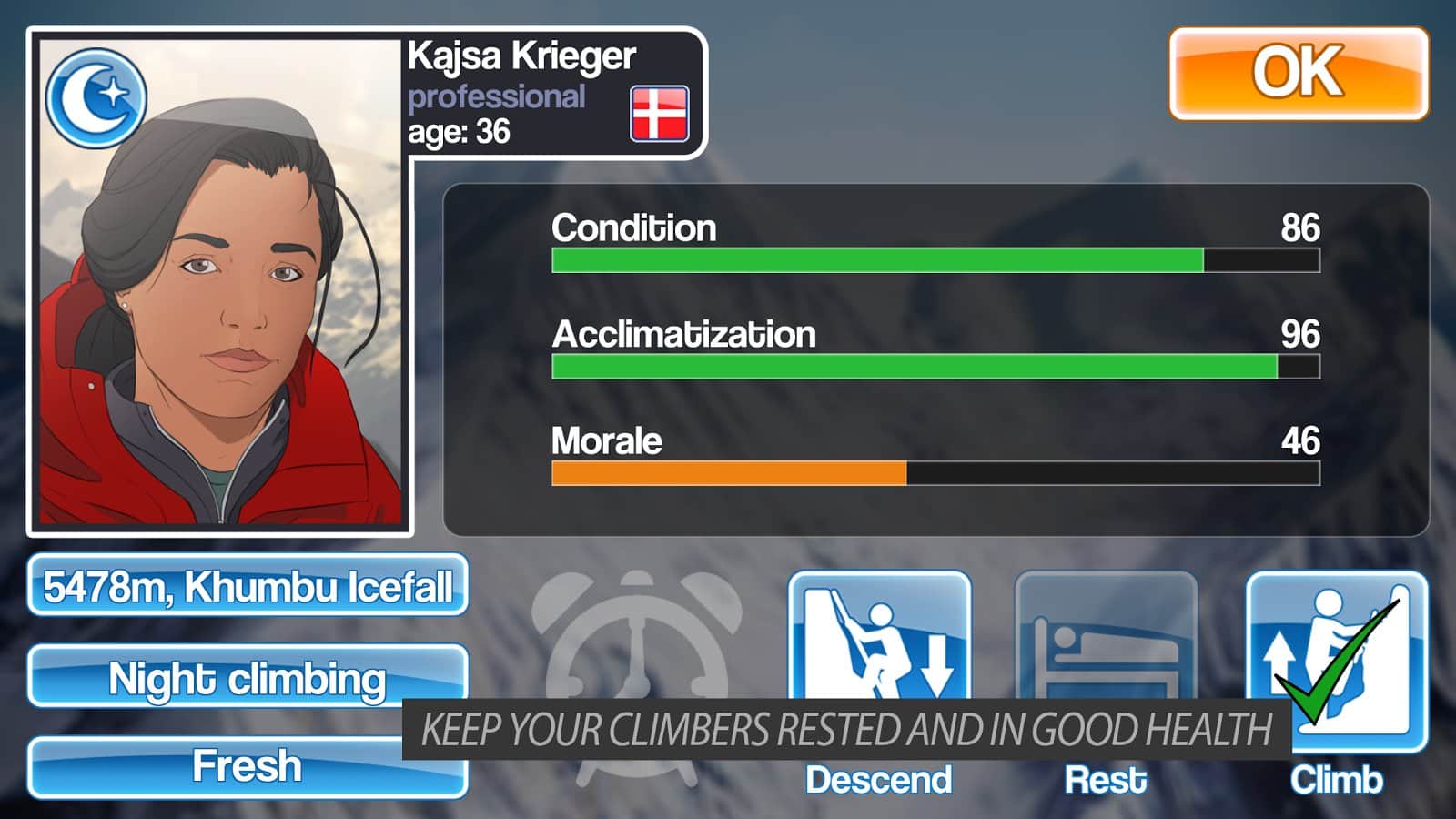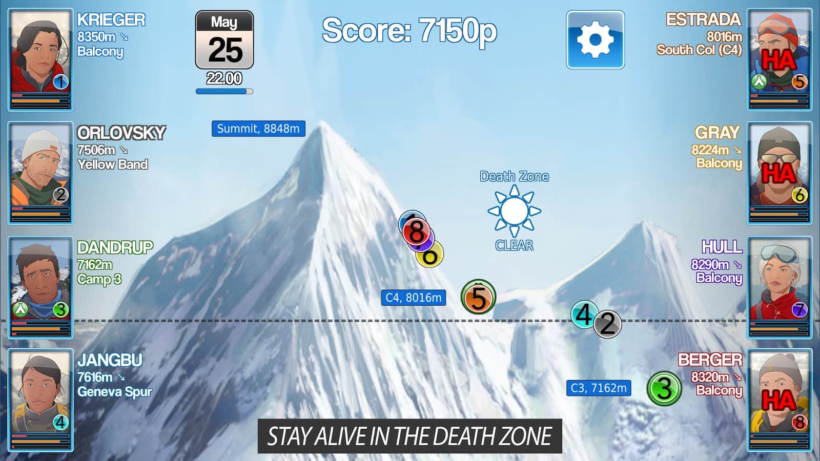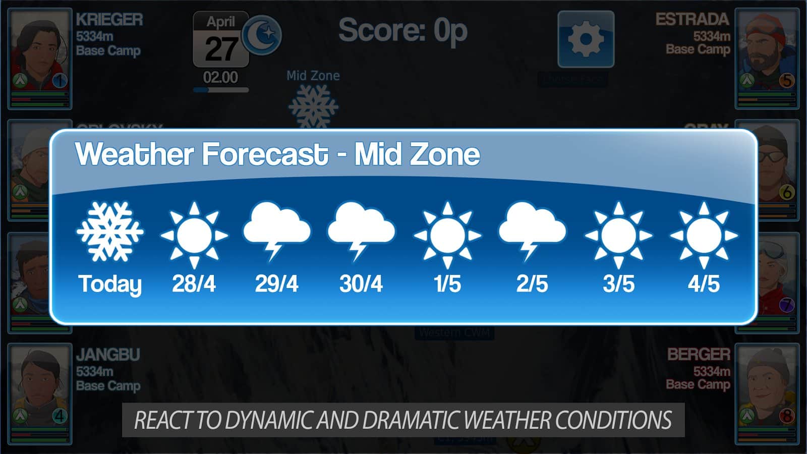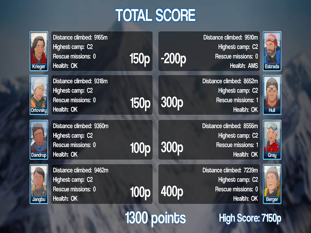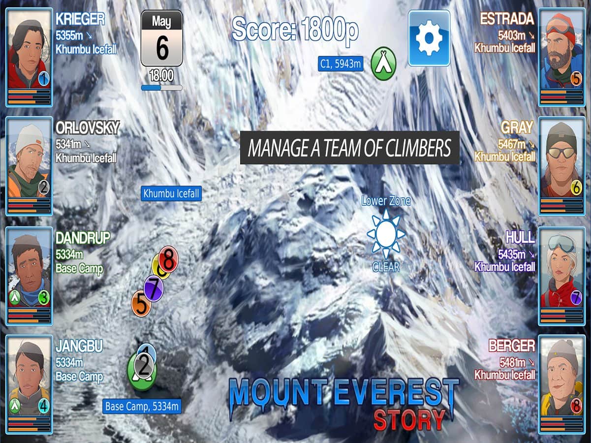 Mount Everest Story - весьма необычная игра в которой вам нужно будет дойти до вершины Эвереста! На первый взгляд игра очень простая, даешь команду и твои альпинисты лезут вверх, однако трудности начнутся уже на первом участке подъема. Дело в том что отдыхать ваши скалолазы могут только в определенных лагерях, и больше негде, поэтому вам предстоит рассчитывать время, погоду, уровень их усталости а так же мораль. Множество факторов влияют на удачный подъем и вам не раз предстоит отступить назад что бы продвинутся дальше.