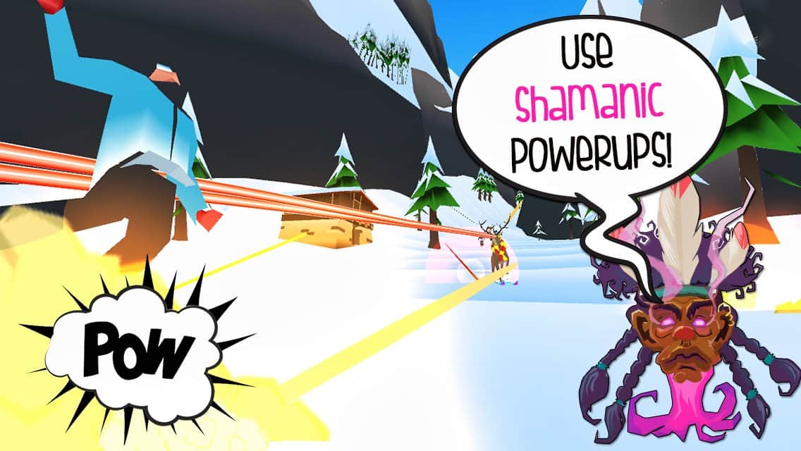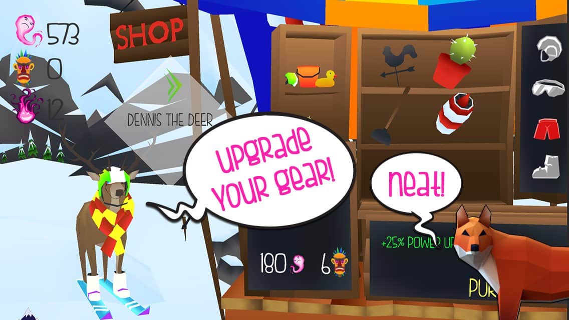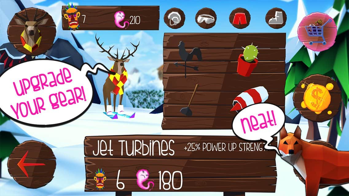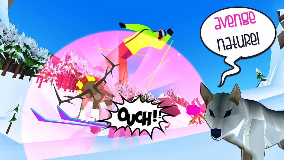 Mountain Rage – необычная игра на андроид, где вы будете управлять оленем, который спускается на лыжах с вершины горы. В этой игре наш герой не просто так встал на лыжи и катается по склона гор, таким образом он хочет уничтожить всех горнолыжников и туристов которые приносят много шума. С помощью шамана олень и волк способны кататься на лыжах и таранить всех людей сбрасывая их с трассы. Возьмите под свой контроль персонажа и проведите его по всем заснеженным трассам, собирая по пути многочисленные усиления, которые помогут животным одолеть людей и выгнать их с курорта. Получайте награды за каждого сбитого горнолыжника и приобретайте для героя новые костюмы и аксессуары.