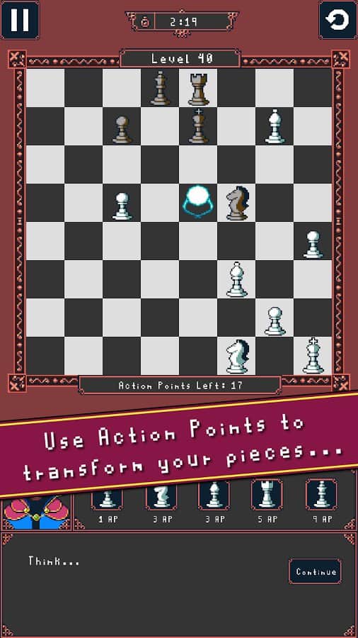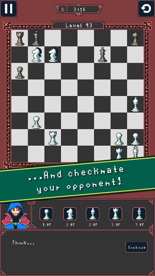 Moveless Chess - шахматная головоломка которая уже достаточно давно покоряет владельцев яблочной продукции. К сожалению на платформе Андроид игра очень долга была в стадии тестирования и просто изобиловала различными багами и вот наконец - то разработчики "выкатили" проект на основу. Шахматные головоломки довольно популярное направления у любителей хорошенько поразмять мозги, оригинальность данного жанра заключается в том что вам не придется соревноваться с соперником, а лишь решать уже поставленные задачи, порой очень сложные. Ко всему прочему создатели Moveless Chess еще и реализовали целый ряд новых игровых решений, систему развития, внушительное количество уровней, популярную сегодня пиксельную графику.