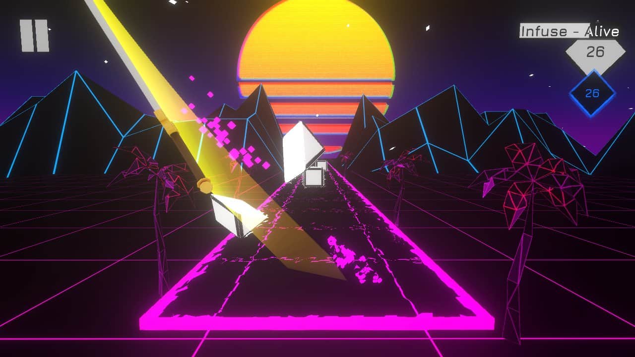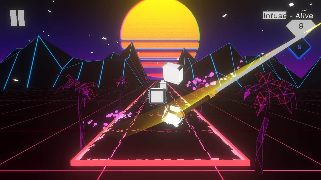 Music Slayer - довольно необычная музыкальная аркада, игровая механика которой сочетает в себе элементы ритм - игры, а геймплей позаимствован у знаменитой Fruit Ninja. И так, ваша задача по средствам свайпов разрубать летящие на вас блоки, при этом весь геймплей проходит под выбранную вами музыку, как следствие лучше всего играть в наушниках. Отличительной чертой Music Slayer является отличная трехмерная графика, что не характерно для проектов данного направления, а так же выбор всевозможного оружия.