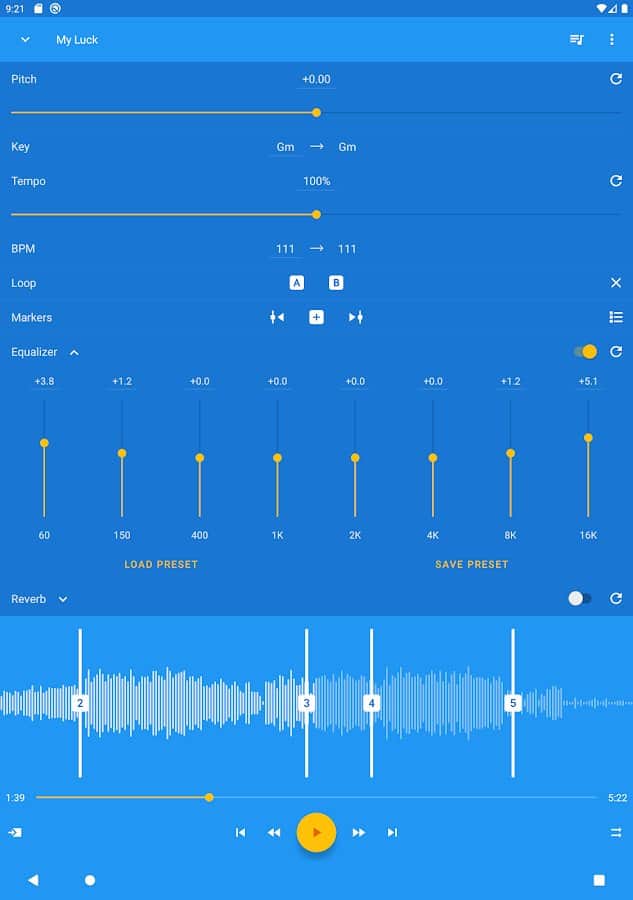 Music Speed Changer - Ускоряйте и замедляйте любые аудиофайлы в тех местах, где вам это необходимо! Изменяйте высоту звучаний композиции на более 24 полутонов, применяйте различные аудиоэффекты (эхо, фленджер и реверберация, создание эффекта караоке), воспользуйтесь 8-полосным эквалайзером, самостоятельно регулируйте высоту и темп аудио. Анализируйте каждое воспроизведение, прежде чем его отредактировать, чтобы сделать это правильно и красиво. Растягивайте временную шкалу и изменяйте скорость звучания аудио от 15% до 500%.