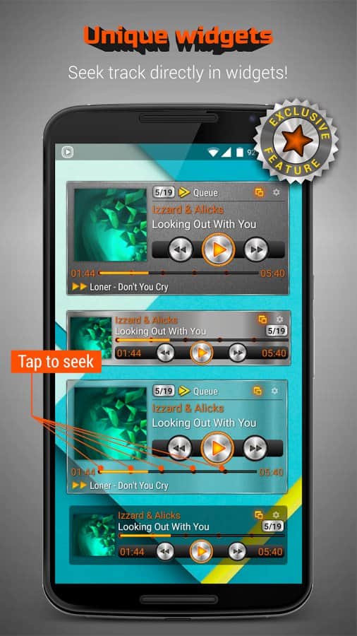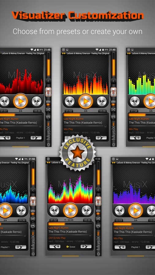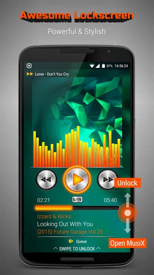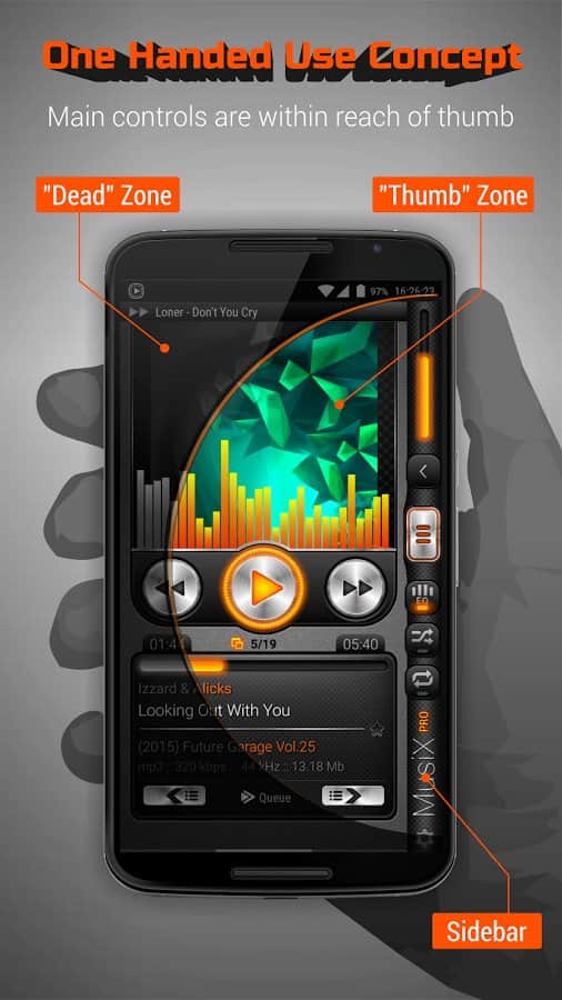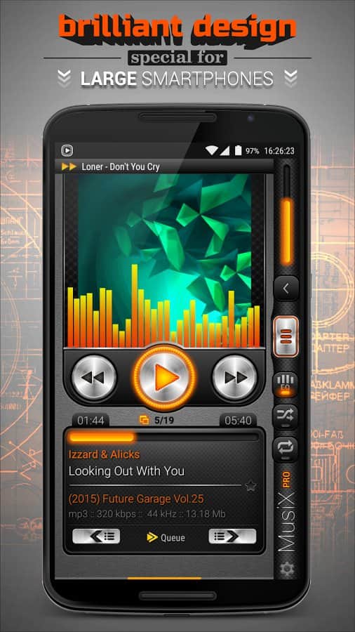 MusiX Player – функциональный плеер с ярким выразительным дизайном, который отлично подойдёт для смартфонов с большой диагональю (4,5-6 дюймов). Специально разработанный дизайн под большие устройства подарят вам незабываемый опыт в использовании плеера. Поддержка большого количества аудио форматов и тонкая настройка эквалайзера - это естественный минимальный набор функций необходимый для любого плеера. Особенности::
