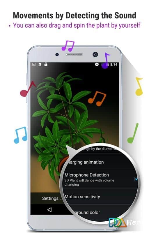 My 3D plant – живые обои на андроид, где вы получите на своем экране пляшущий куст. Наблюдайте и ухаживайте за своим растением, а также меняйте фон и различные настройки. Если вы хотите наблюдать за тем, как растет ваше растение и меняет свой внешний вид, то устанавливайте это приложение. Обои порадуют своих обладателей тем, что на экране покажется уникальное растение, но и тем что оно будет реагировать на движение, звук и прикосновение к экрану. Оформление экрана будет меняться в зависимости от вашего времени суток. Установка этих обоев не займет у вас много времени.