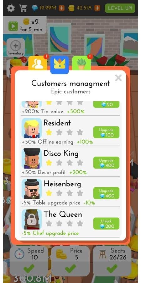 Мечтать о своем кафе может каждый, главное с чего-то начать и улучшаться, чтобы продвигаться дальше и дальше. В самом начале будете только вы, вегетарианские бургеры и несколько покупателей. Со временем будут деньги нанять профессиональных шефов, расширить меню и регулярно пополнять склад ингредиентами, улучшать скорость работы, повышать цены на блюда и декорировать помещение. Придется много кликать, но затем расслабиться и наслаждаться видом всего процесса. Станьте не просто знаменитым магнатом, но и владельцем лучшего ресторана в мире!