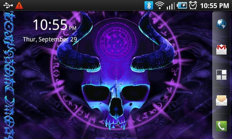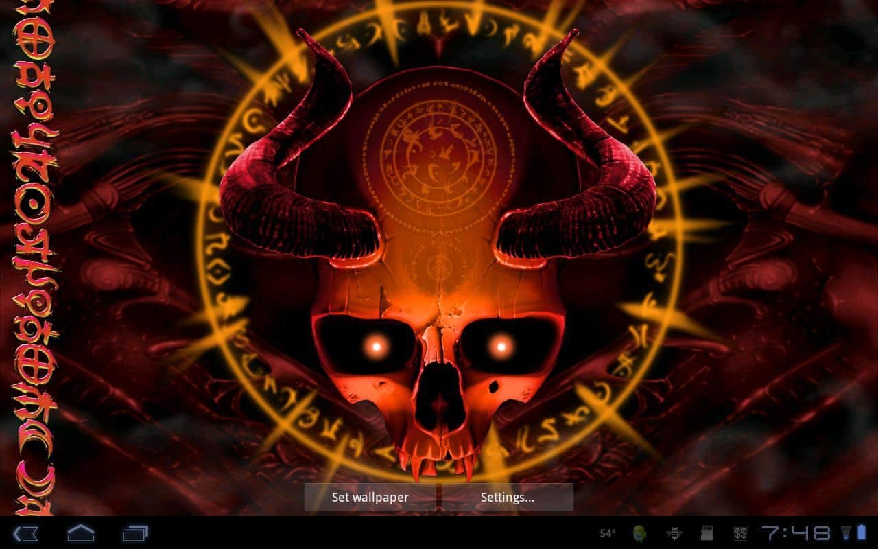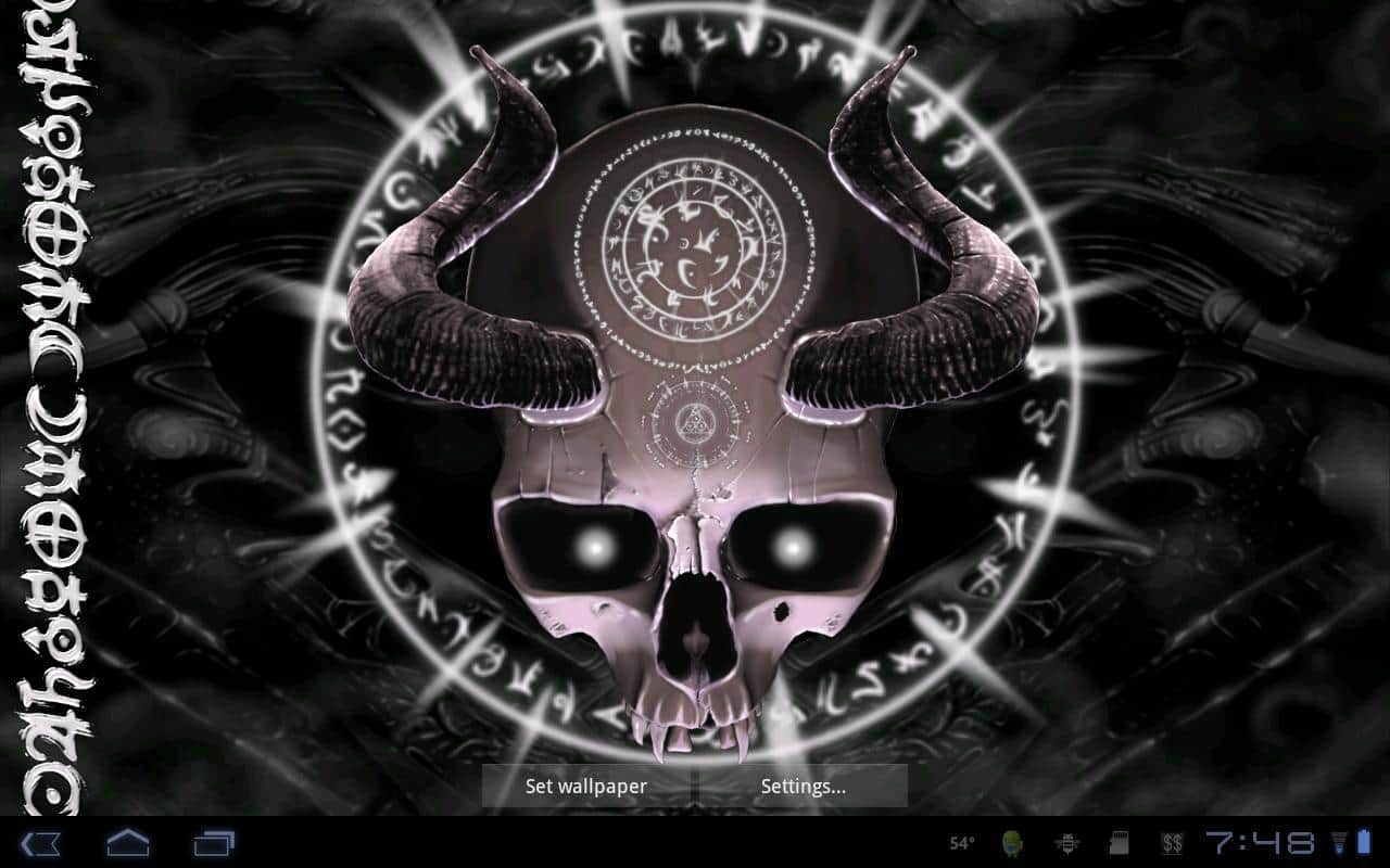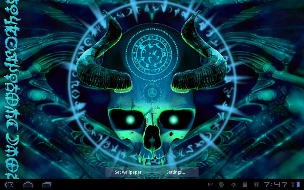 Mystical Skull Live Wallpaper – мистические живые обои для андроид устройств от разработчика Adam Ratana для любителей подобного стиля. Из настроек: скорость анимации и направление прокрутки. Возможность выбора одной из 5 тем: красный, зеленый, фиолетовый, голубой, серый. Кольцо символов вокруг черепа реагирует на касание, а бегущая строка всевозможных знаков придает обоям еще более ужасающий вид.