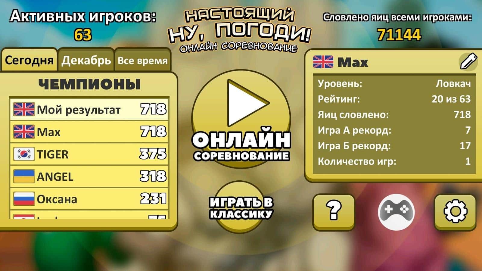 "Настоящий Ну, Погоди! Онлайн" - это игра-соревнование, в котором волк ловит яйца и набирает все больше и больше очков без ограничений. Чем больше яиц в каждом уровне он поймает, тем выше будет рейтинг игрока и его общий результат в таблице турниров. Завоевывайте новые награды и звания, станьте первым в рейтинге лидеров соревнования, выбирайте одну из предложенных тем интерфейса: черно-белую или цветную. Правила игры не отличаются от оригинальной версии, в них нет изменений. Насладитесь знакомым всем музыкальным сопровождением, возможностью установить вибрационные звуки и играйте без лагов и зависаний в свое удовольствие!