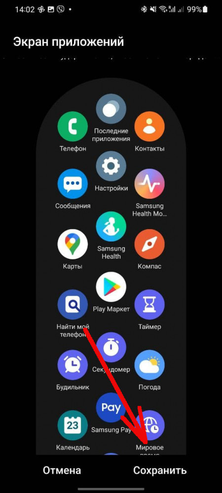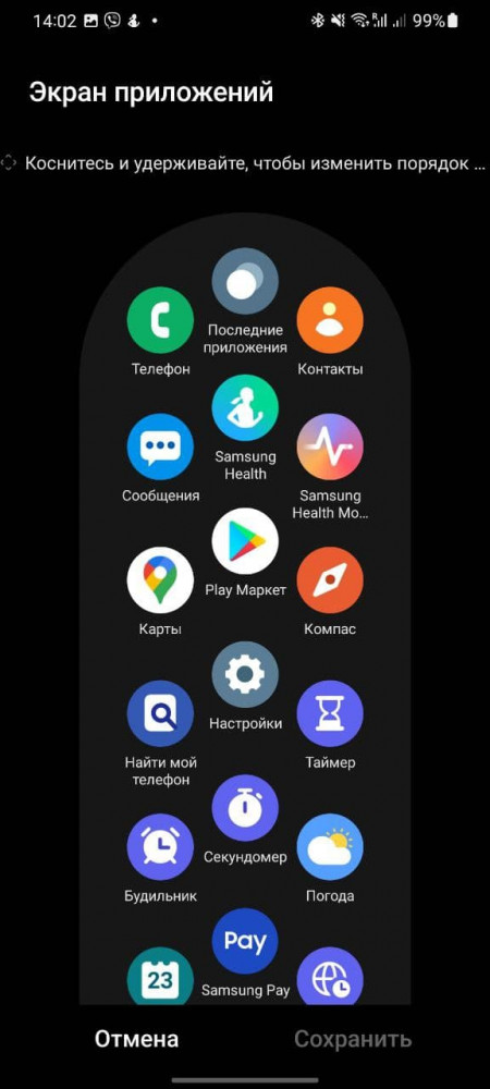 Если эту манипуляцию удобнее выполнять из фирменного приложения, действия будут примерно такими же. Переходим в Galaxy Wearable — Экран приложений. Расположение ярлыков здесь будет таким же, как и на часах, разве что, на большом экране смартфона их проще рассмотреть. Для перемещения, вновь удерживаем нужную иконку и двигаем туда, где ее легко будет найти. Или же, напротив, прячем лишнее в самый конец списка. Чтобы закрепить внесенные изменения, нажимаем кнопку “Сохранить”.