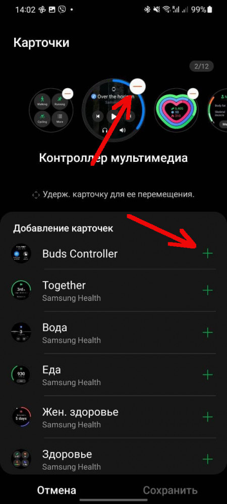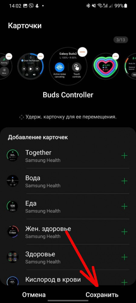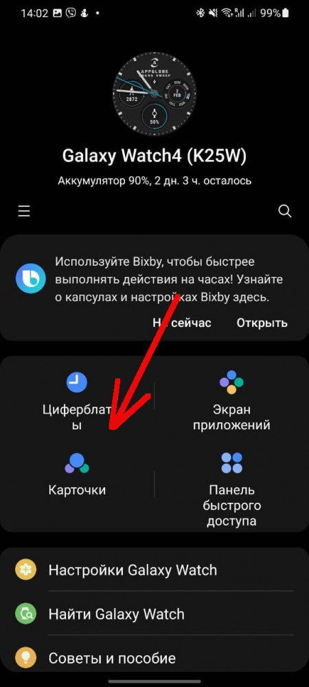 Чтобы проделать эту манипуляцию на смартфоне, переходим в приложение Galaxy Wearable — Карточки. Отсюда их можно не только удалить, но и добавить новые, они будут доступны в виде списка ниже. Всего на часах может отображаться до 15 карточек.