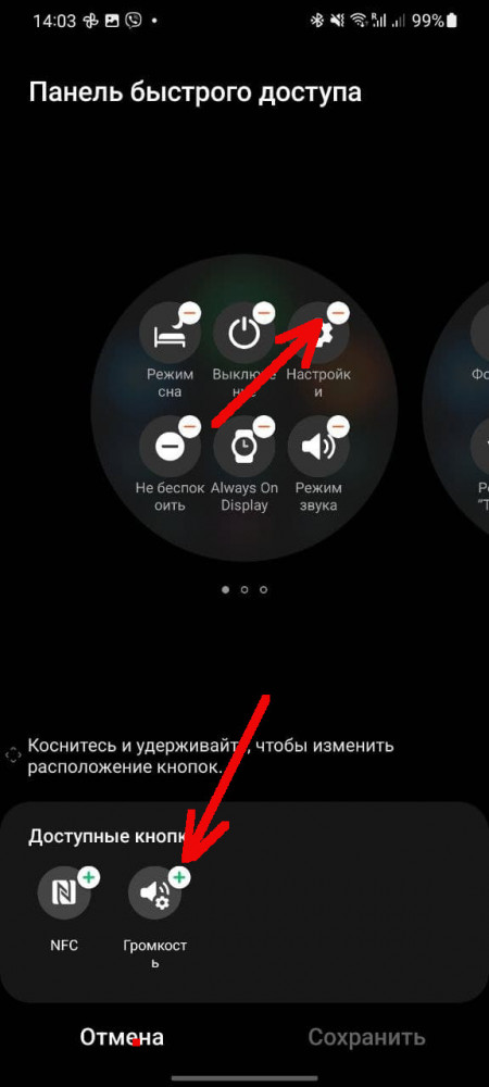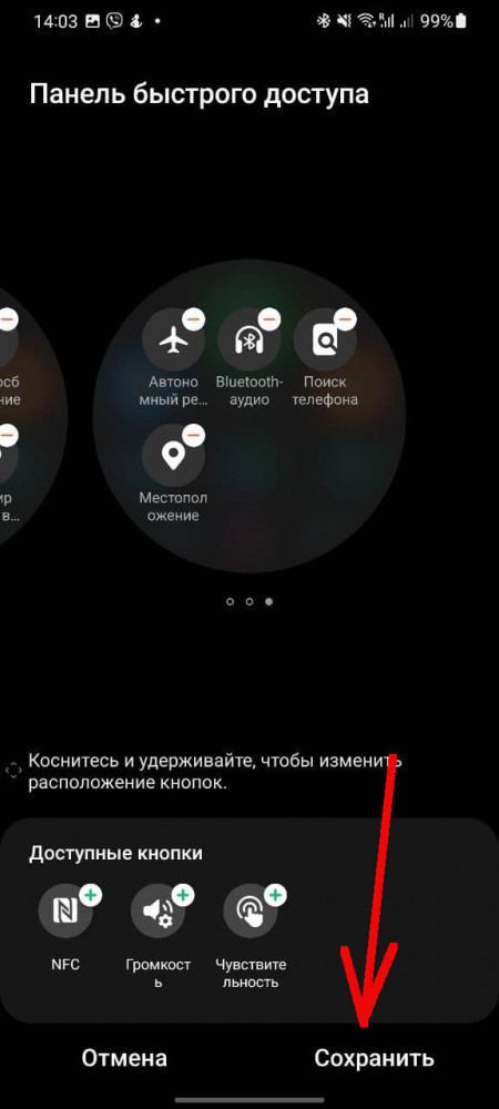 И вновь нам на помощь приходит приложение Galaxy Wearable. В нем находим раздел “Панель быстрого доступа”, где и собраны все быстрые переключатели. Принцип работы все тот же: ненужные кнопки можно удалить, просто нажав на “-” или изменить их расположение перетаскиванием. Также из приложения можно добавить дополнительные быстрые переключатели.