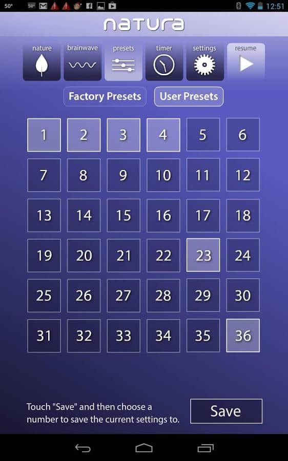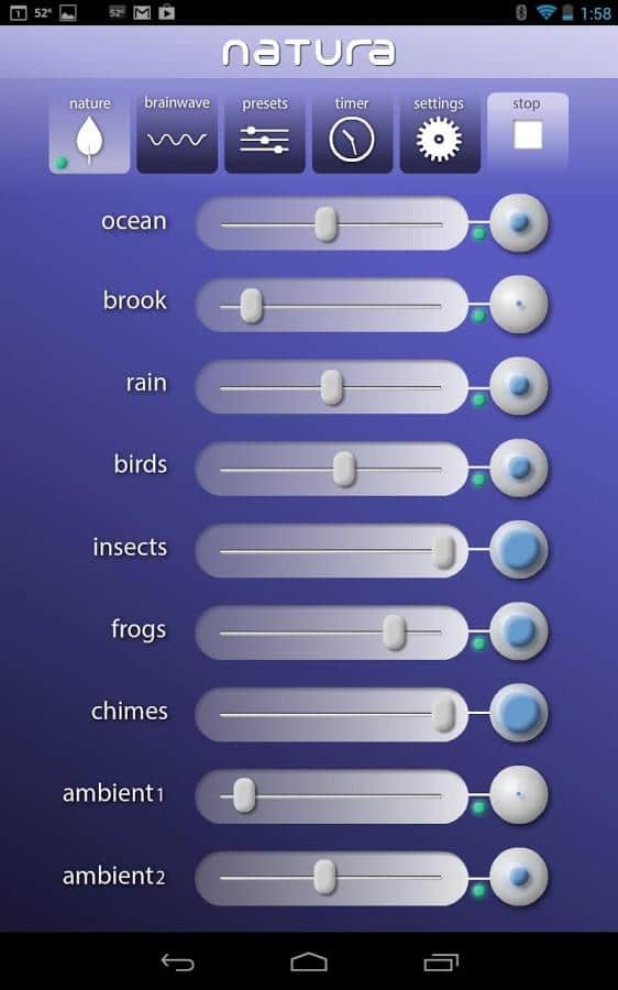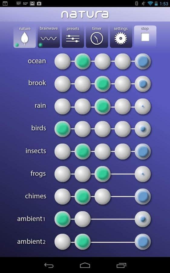 Natura Sound Therapy - приложение для андроид, которое позволит вам создать приятный звуковой фон. Приложение активно используется в рамках звуковой терапии (частично в йоге и спа-салонах). С помощью данной программы вы сможете расслабиться и отвлечься от беспокоящих вас мыслей. Звуки природы, шум дождя, ветер, пение птиц и другие приятные звуки помогут восстановить равновесие и баланс. Кроме того, вы сможете самостоятельно создавать собственные композиции. Интерфейс удобен и прост. Приложение содержит: