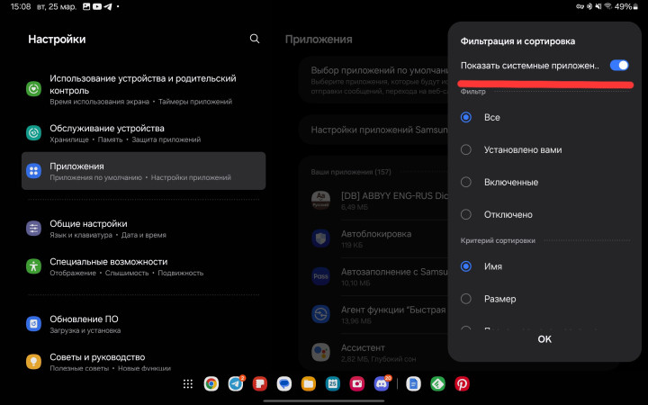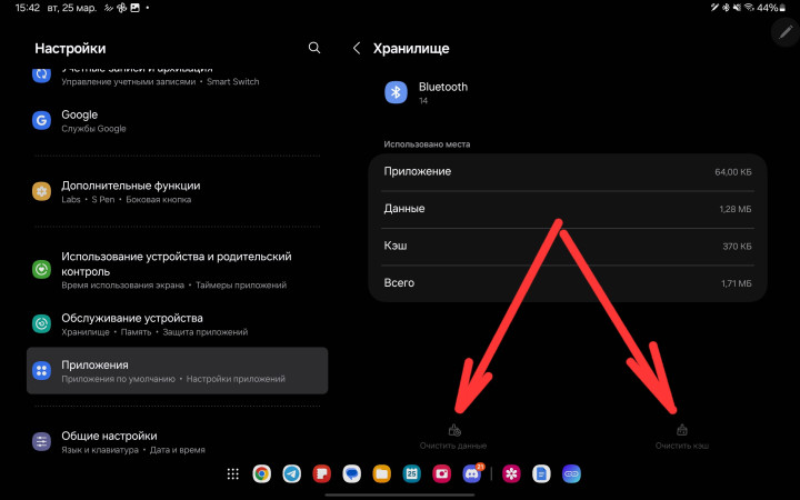 Как и любая другая программа на вашем смартфоне, Bluetooth сохраняет временные файлы и очистка этих данных может помочь решить программные проблемы. Переходим по пути Настройки — Приложения, здесь нажмите на иконку “Фильтр” напротив пункта “Ваши приложения” и активируйте переключатель “Показывать системные приложения”. В новом расширенном списке найдите Bluetooth — Хранилище. Снизу вы найдете ярлыки для очистки кэша и данных.