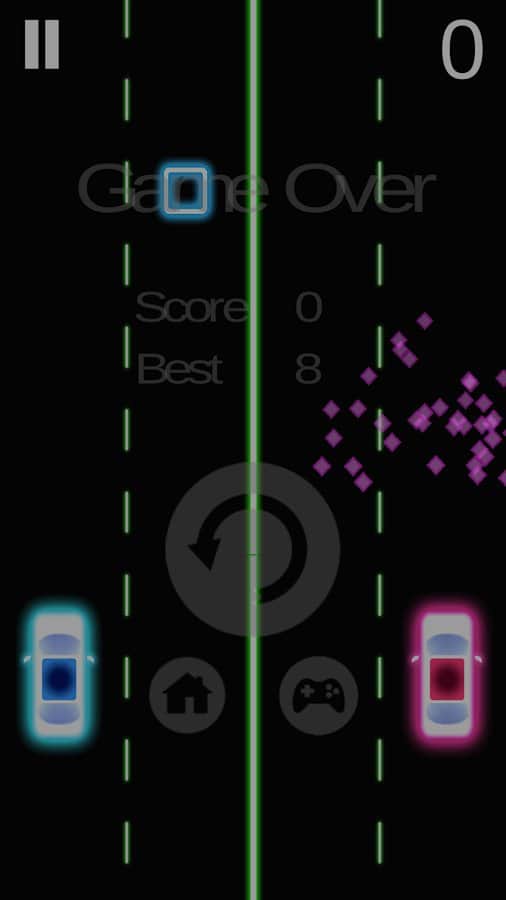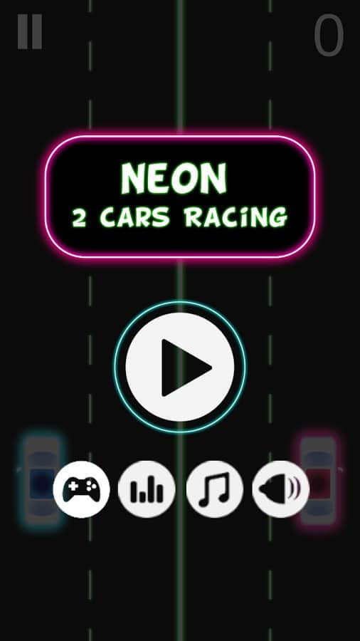 Neon 2 Cars Racing – динамичные гонки на андроид, где вы будете управлять сразу двумя автомобилями. В этой игре с неоновой графикой вы возьмете под свой контроль два автомобиля, которые едут по разным трассам находящимся параллельно друг другу. Ведите свои автомобили вперед и остерегайтесь столкновений с преградами и квадратами при этом не забывайте собирать треугольники и круги. Покажите на деле все свои навыки отличной езды и хорошие рефлексы, которые также пригодятся вам. Жмите на экран своего телефона или планшета с той стороны, какой машинкой вы хотите управлять и избегайте столкновений. Добейтесь рекордных результатов в этой игре и поднимитесь на самый верх таблицы лидеров.
