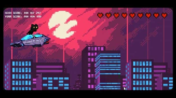 Я скажу ещё коротко про игру: красивая пиксельная графика в стиле киберпанка, простое управление, хорошая музычка и можно менять внешность своего котика