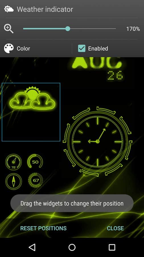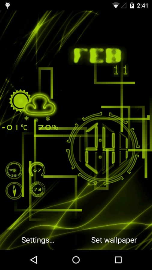 Neon Clock GL Live wallpaper – интересные живые обои для андроид в виде неоновых часов. В том числе на экране отображаются: заряд батареи, компас, частоты процессора, температура и др. приложения по желанию. Из возможностей настроек присутствуют: изменение фона и каждого элемента, вид компаса, количество и цвет протекающих линий.