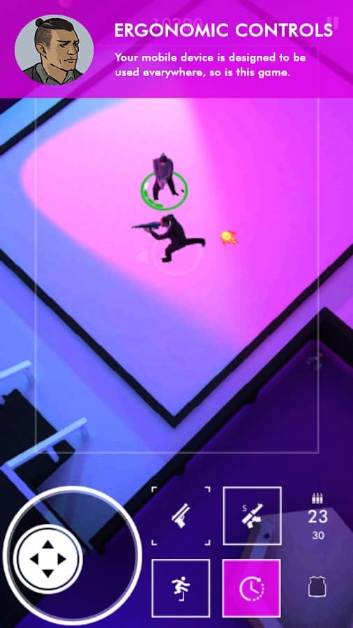 Управление - это просто кошмар... Это не просто стик в обычном его понимании... Стиком указываем направление и перс начинает автоматом бежать в указанном направлении, для его остановки нужно тапнуть в центре этого недостика... Стрельба\прицеливание - просто нужно тапать в место, куда нужно стрелять...