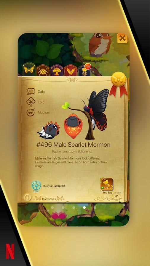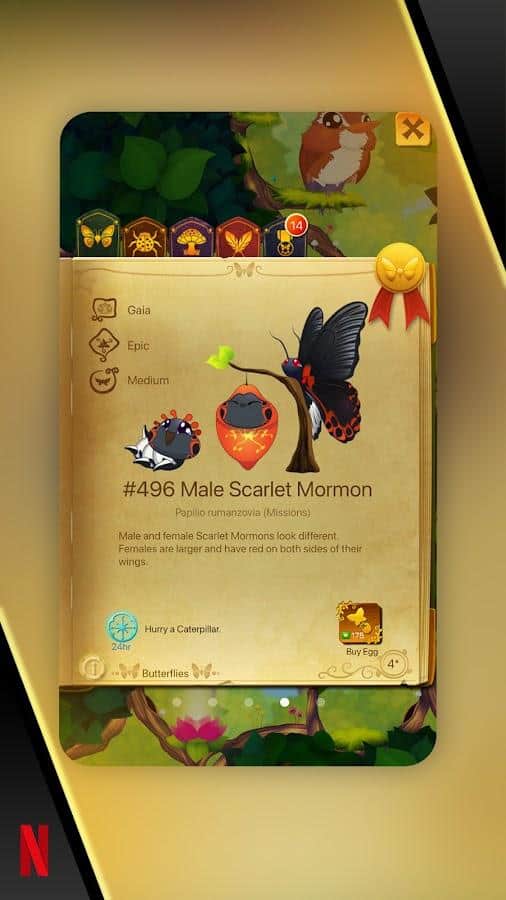 Netflix Butterfly Haven: Волшебный лес - Эксклюзивное приложение для подписчиков Netflix! Погрузитесь в мир удивительных и красочных бабочек.. Создайте идеальную среду обитания для этих нежных существ, украшая свой волшебный лес и привлекая сотни реальных видов бабочек. Соберите их всех и насладитесь великолепием их превращения из милых гусениц в сияющих бабочек. Сделайте свой лес уникальным, добавляя растения и цветы, чтобы привлечь новых крылатых друзей. Эксклюзивный набор бабочек только для версии Netflix.