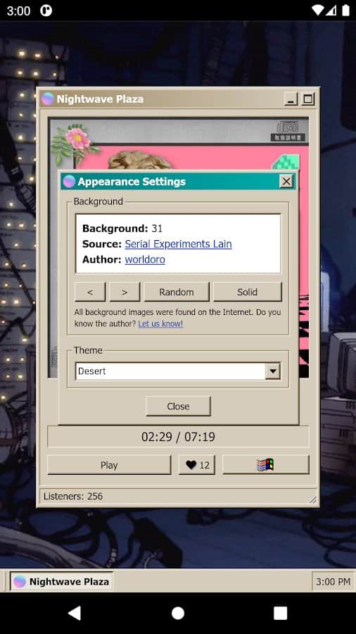 Без шуток, я долго подобное искал. Приложуха представляет собой радио, простенькое но атмосферне. Интерфейс сделан а-ля винда 98. Ну и на фоне разные кайфовые гифки из аниме или фоны а-ля retro wave.