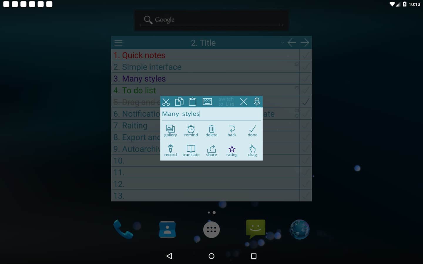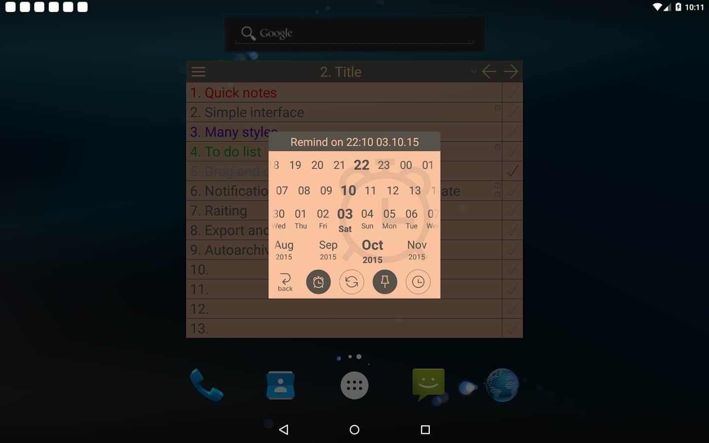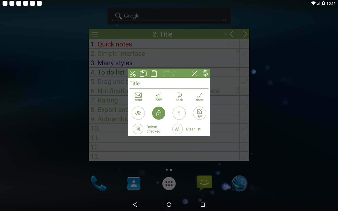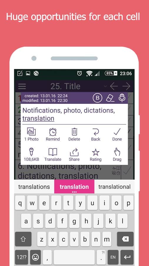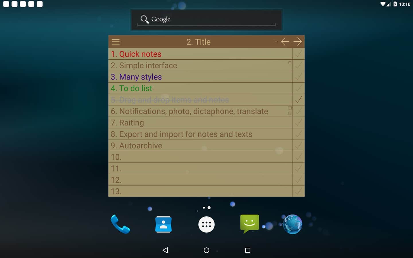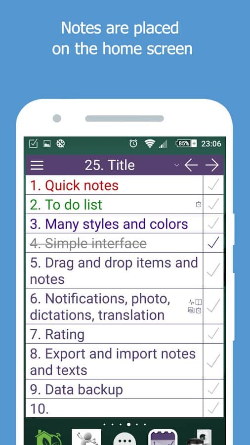 NoteToDo. Notes. - С помощью этого простого приложения, вы сможете не только оставлять для себя заметки, но и составить список дел на день или даже месяц. Простой и понятный интерфейс делает его одним из лучших в своем роде. А так же оно практически не занимает памяти в вашем смартфоне. Больше не нужно носить блокнот под рукой, ведь он есть у вас в смартфоне. Так же здесь есть удобный виджет, так что вам не придется постоянно включать его, просто вынесите виджет на рабочий стол, и добавляйте заметки прямо оттуда.
