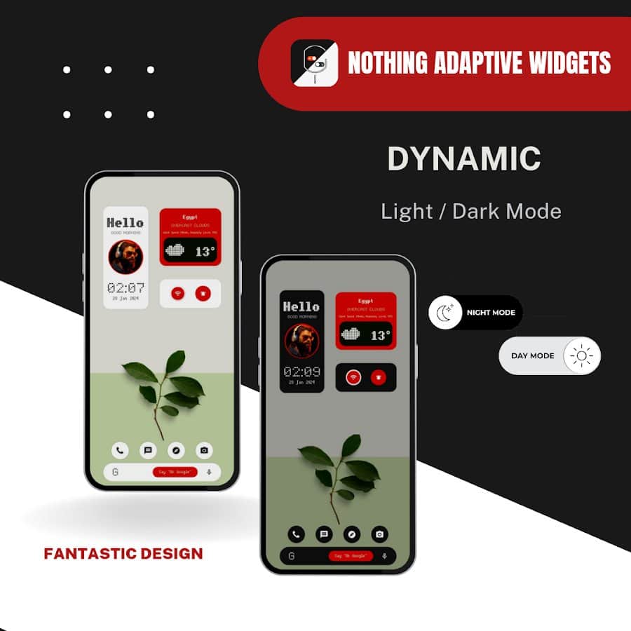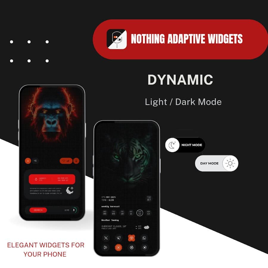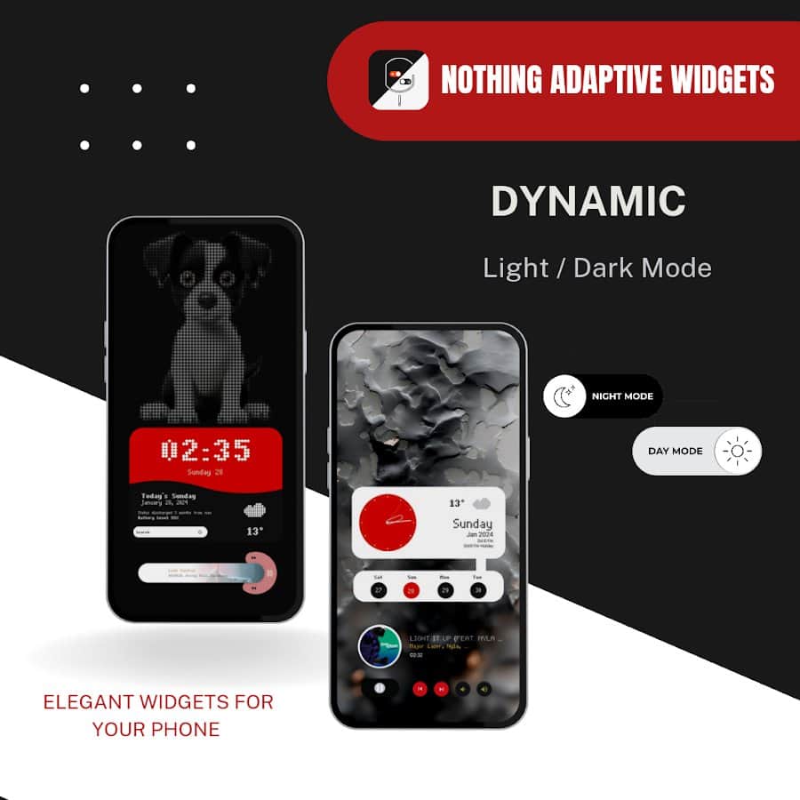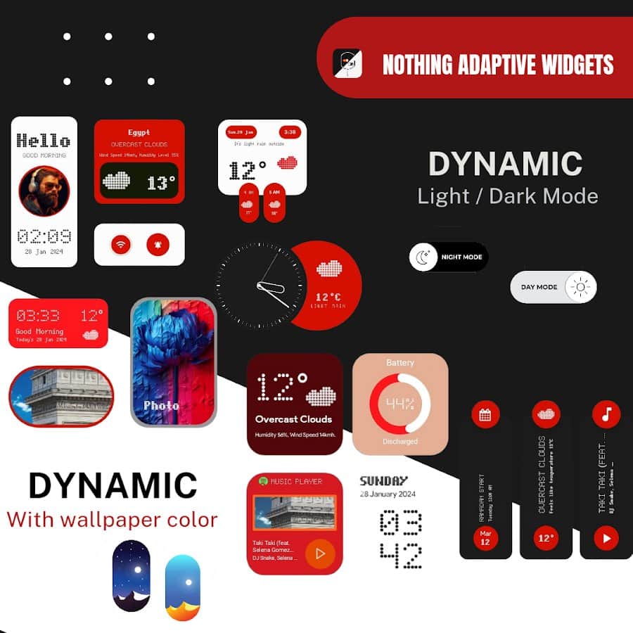 Nothing Adaptive widgets - Адаптивные виджеты с элегантным интерфейсом, которые автоматически переключаются между ярким дневным режимом и приглушенным ночным режимом, предоставляя важную информацию одним взглядом без вмешательства пользователя. Nothing Adaptive widgets отличается тем, что содержит виджеты, которые динамически взаимодействуют с цветами обоев, придавая уникальный эстетический вид каждому установленному вами обоя, что делает ваш экран более привлекательным и функциональным.
