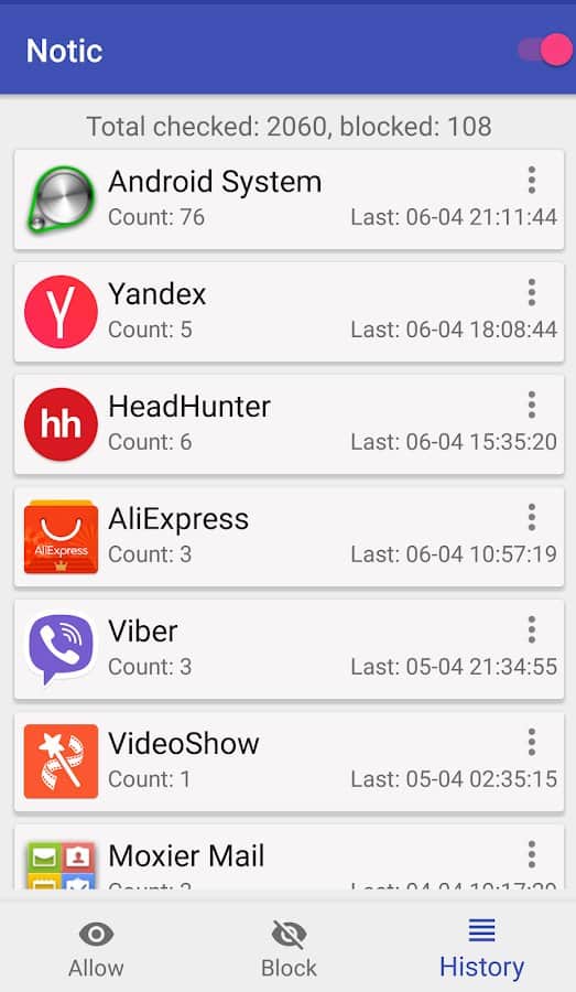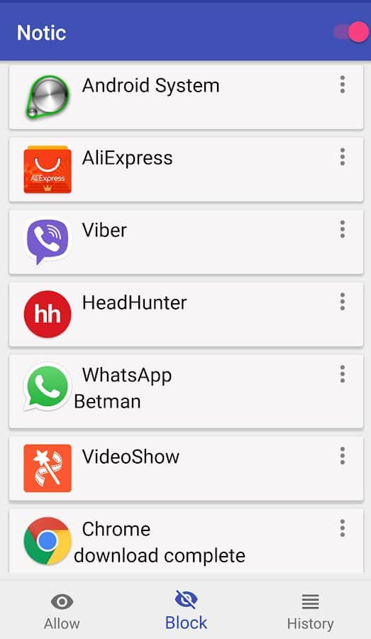 Если вы уже устали игнорировать однообразные уведомления на экране вашего мобильного устройства, но и не хотите избавляться от установленных приложений, которые их рассылают, то вам пригодится Notic - notification control. Вы сможете составлять в нем белые и черные списки, в любой момент времени запрещая или вновь разрешая рассылку уведомлений. Помимо этого вы сможете блокировать сообщения по отдельным фразам и названиям в заголовках, а также просматривать и мгновенно очищать историю сообщений.