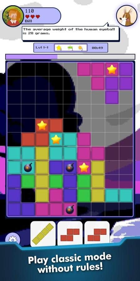 NotTetris - Brick Block Puzzle Game – уникальная головоломка, которая подойдёт абсолютно каждому:и взрослым, и детям, и начинающим и продвинутым игрокам данного жанра. Выбирайте один из доступных режимов сложности: классический, в редисе реального времени или приключение и начинайте. Вам будет необходимо заполнить пустые вертикальные и горизонтальные полосы. Открывайте геометрические фигуры и размешайте их в блока всего в одно касание, проходите уровни и набирайте очки и бонусы, продвигайтесь в рейтинге и развивайте интеллектуальные способности.