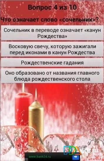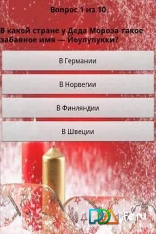 Новогодняя викторина - Великолепная новогодняя викторина на андроид, которая проверит, все ли вы знаете про праздник, который празднуют каждый год, а именно Новый Год! Игра не только будет задавать вопросы, она еще может подарить вам много полезных фактов об этом празднике. Так же в комплекте с игрой вы получите виджет на ваш главный экран, который с точностью покажет сколько времени осталось до нового года, а также в окне периодически будут появляться интересные факты об этом празднике.
