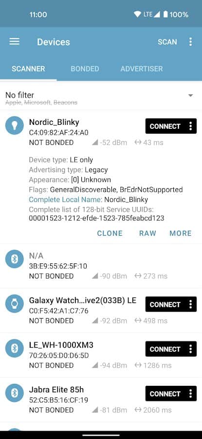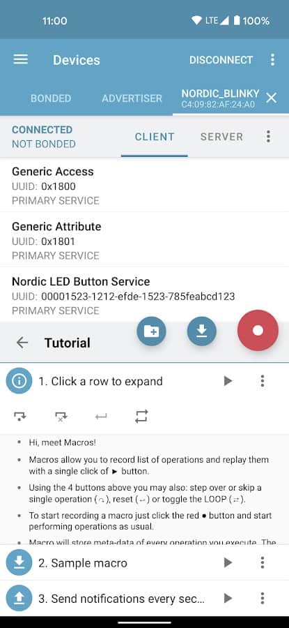 RF Connect for Mobile - приложение, которое способно сканировать и обнаруживать устройства с низким уровнем BLE (Bluetooth low energy). Также у этого приложения есть множество других полезных функций, которые облегчат жизнь: обнаружение и разбор сервисов и характеристик, анализ характеристик, запись операций с помощью макросов и другое. Приложение будет полезно тем, кто хочет узнать многое о своих BLE девайсах и по возможности записать эту информацию.