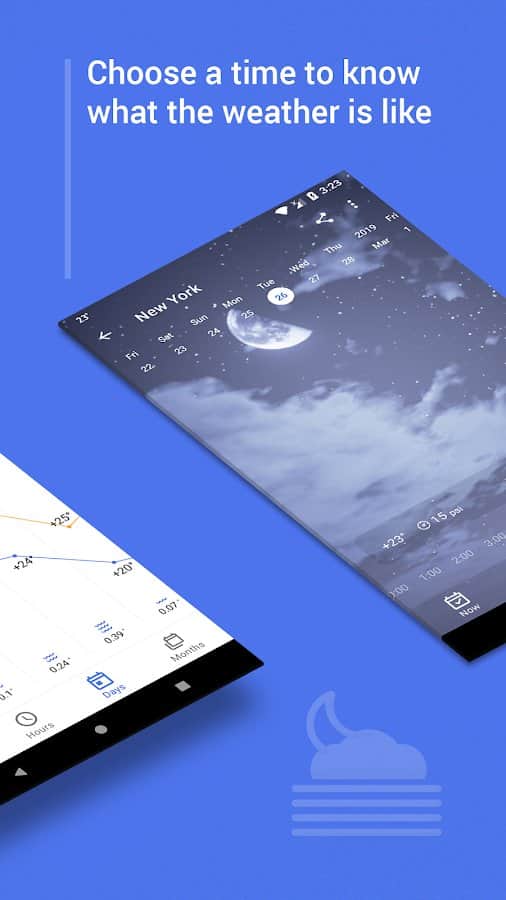 • Отображение облачности, осадков, направления ветра, температуры воздуха, влажности, положения луны и солнца;