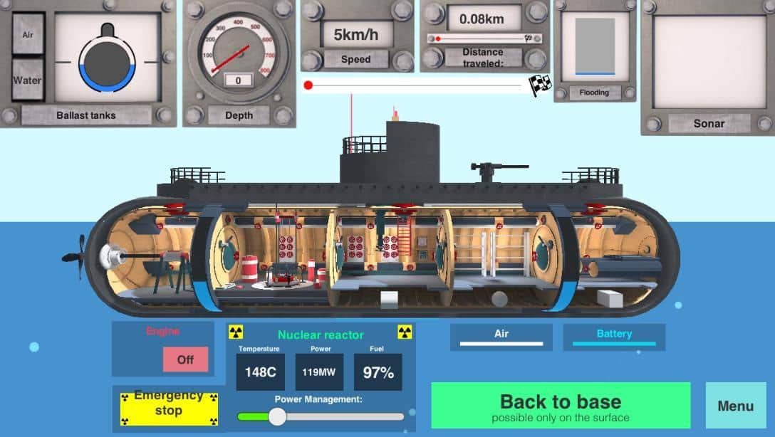 Nuclear Submarine inc – отличный симулятор подводной лодки на андроид, с ядерным реактором. В этой игре вы будете выступать в роли капитана подводной лодки, который столкнется с многочисленными сложностями и авариями. Вы будете управлять подводной лодкой, погружаться на глубину, обходить скалы и не допускать аварий на ядерном реакторе, которые могут привести ко второму Чернобылю. Играйте в эту игру и получайте максимум удовольствия от захватывающего процесса и детальной подводной лодки. Применяйте к лодке новые корпуса, которые позволят опускаться ей на невероятные глубины, а также устанавливайте новые двигатели, стирлинг и ядерные реакторы. Выполняйте все миссии и задания, предложенные игрой.