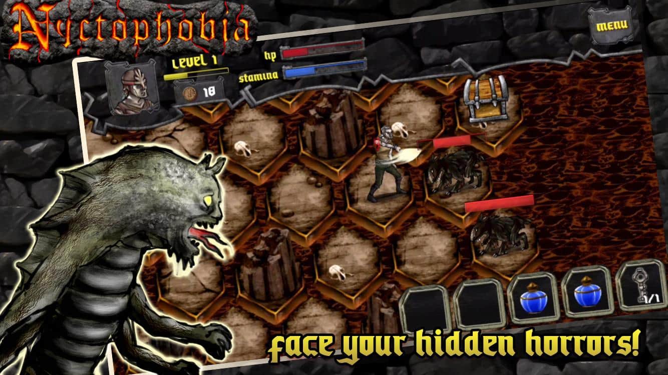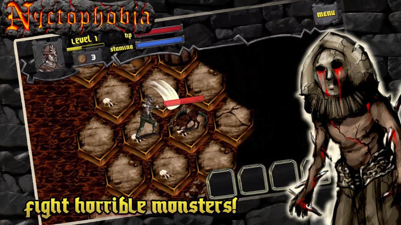 Nyctophobia Monstrous journey – игра в которой вы будете бороться против ужасных и страшных существ вернувшихся с ада. Вы главный герой по имени Nycto вас 20 лет держали в заточении глубоко под землей и вот настал тот час когда вы понадобились для того чтобы защитить планету от нашествия ужасных монстров. Ужасные чудовища украли волшебный артефакт, который держал равновесие в этом мире и теперь наступил хаос. Вашей задачей будет исследовать темное подземелье и пытаться там найти ключ, который откроет дверь на следующий уровень. Затруднять движение вам будет темнота, в которой вы будите видеть только несколько фрагментов вокруг вас и ужасные монстры плот создания генной инженерии. Исследуйте как можно больше территорий и ищите там сундуки с оружием, броней и возможностью улучшить вашего героя.