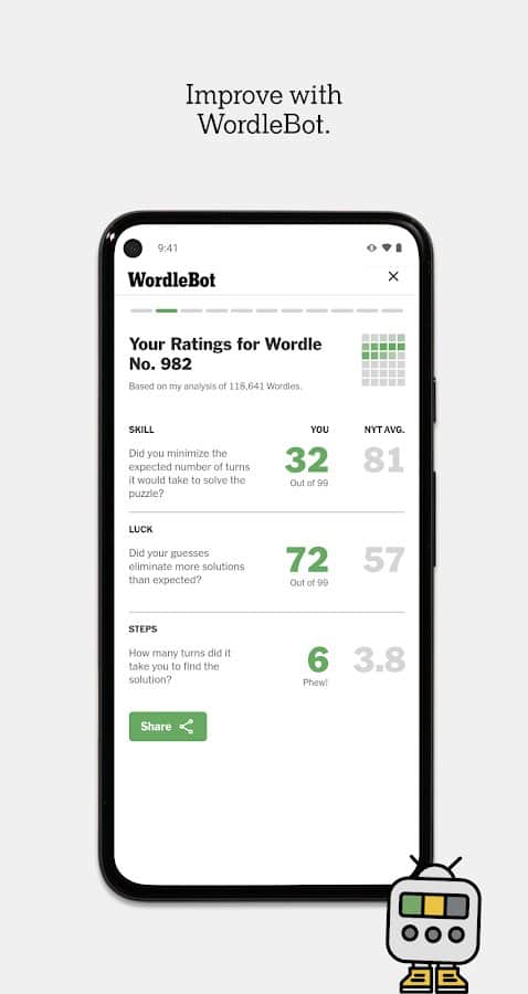 WORDLE - Классическая игра от создателя Джоша Уордла. Угадайте 5-буквенное слово за 6 попыток или меньше. Проверьте свои стратегии против WordleBot, нашего искусственного интеллекта-помощника.